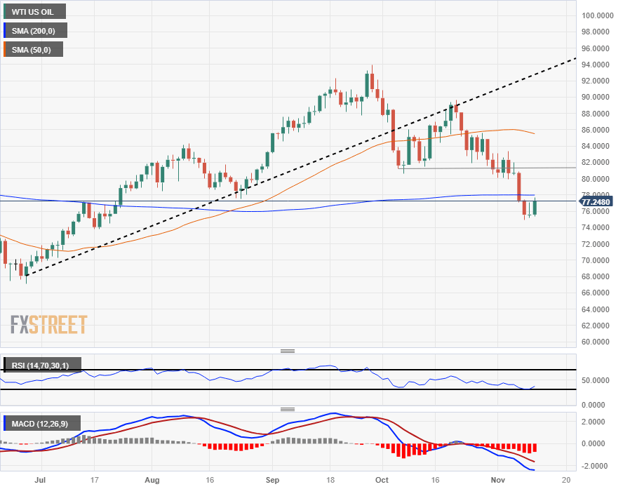 West Texas Intermediate (WTI) Crude Oil prices have rebounded 2.8% on Friday, climbing from a daily low of $75.35 and testing into $77.50 heading towards the close after a rough week that has seen WTI shed 8.61% peak-to-trough.