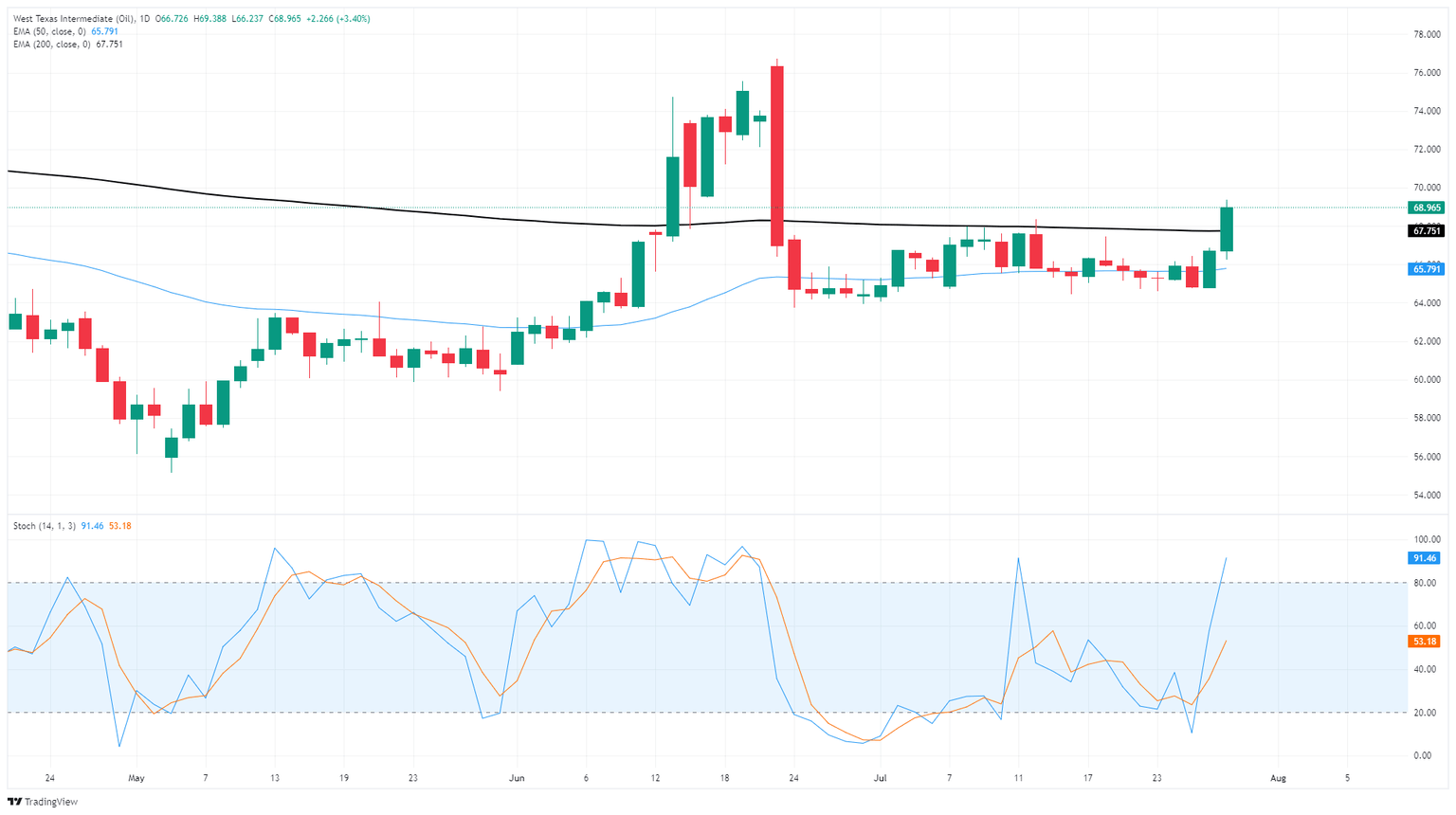 With stiff trade penalties on the docket for energy markets, WTI has jumped into a new price band just north of the 200-day Exponential Moving Average (EMA) near $68.15. Price action has broken through the key moving average for the first time in over a month, and price action is headed back to $70.00/bbl.
