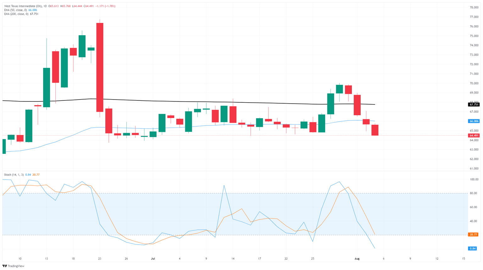 Bullish momentum has evaporated out of the WTI charts, with US Crude Oil barrels struggling to find a foothold after backsliding nearly 8% top-to-bottom from late July’s peak just above $70.00 per barrel. WTI has tumbled back below $64.50, accelerating a near-term decline as US barrel bids chalk in a fourth straight daily decline.