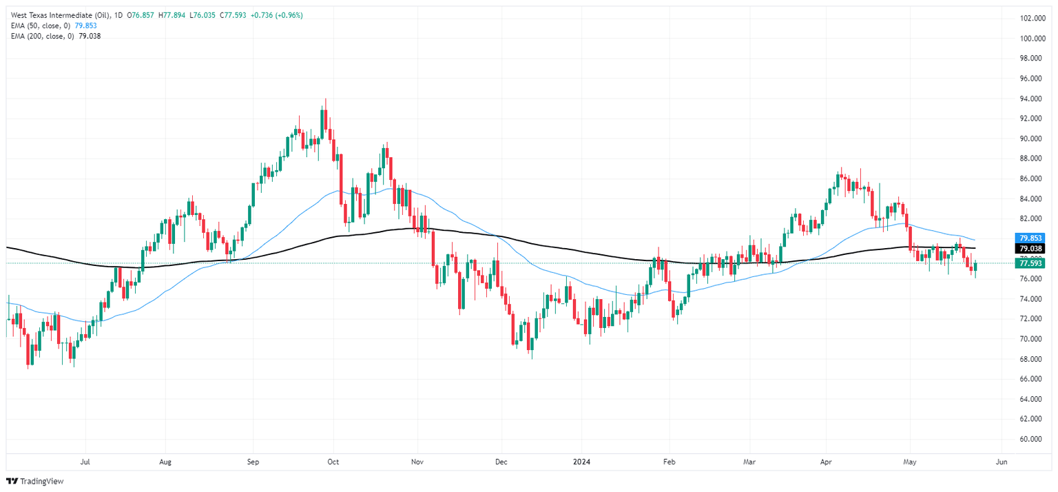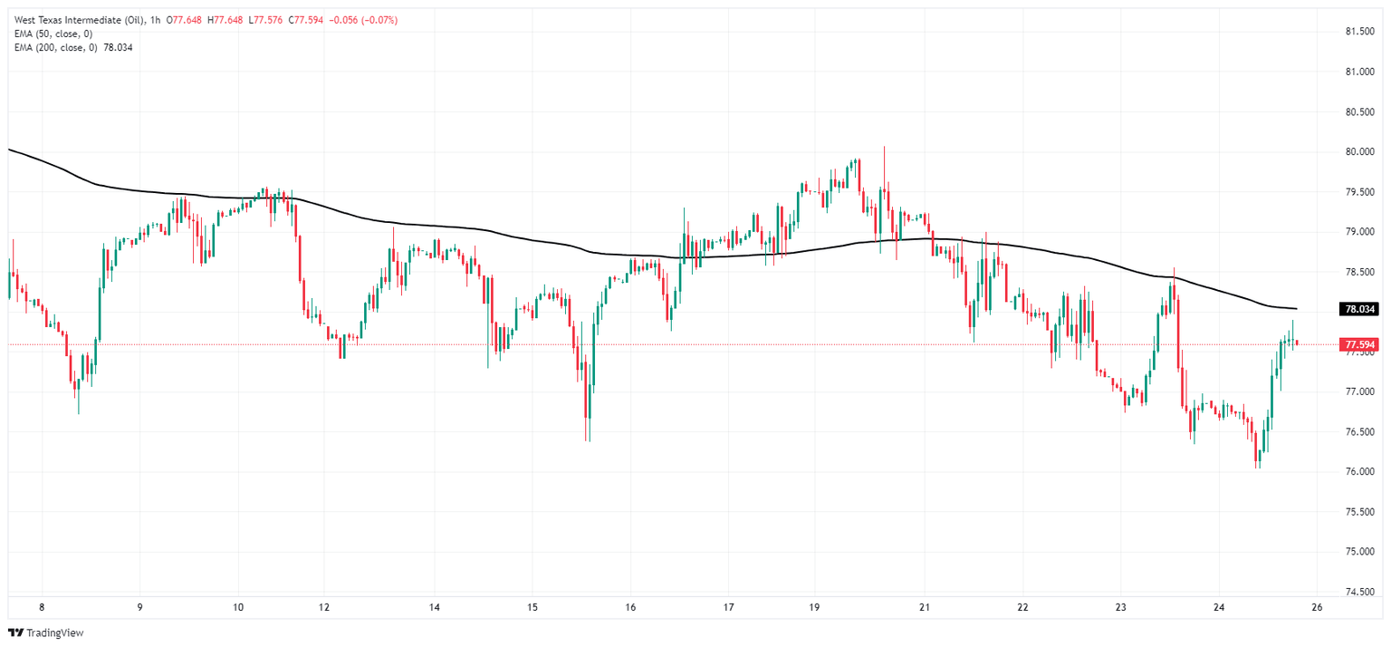 US Crude Oil rebounded from a 12-week low to recapture the $77.50 level ahead of the week’s close. WTI continues to trade on the bearish side of the 200-hour Exponential Moving Average at $78.05, but Friday’s bullish recovery sends US Crude Oil back into familiar technical congestion.