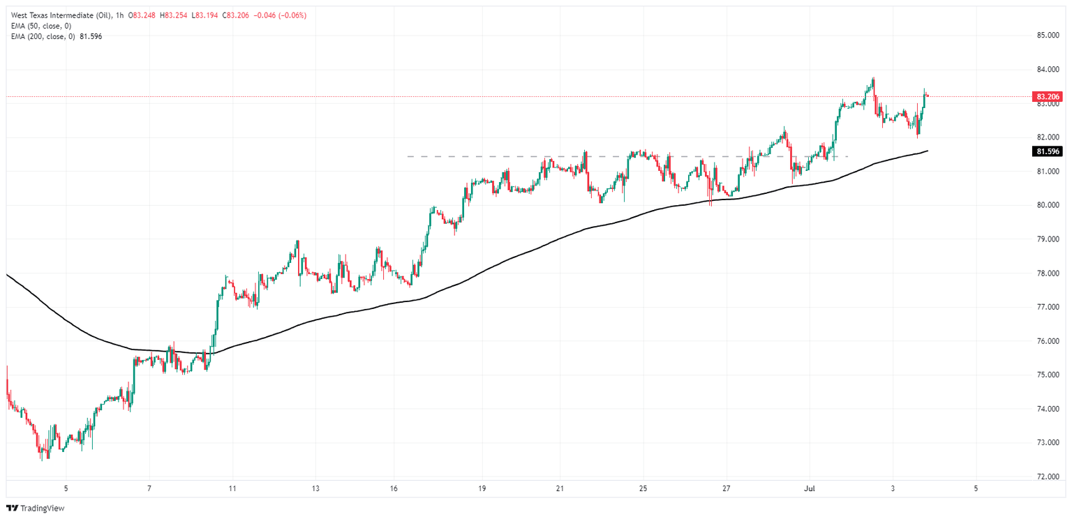 Despite a bullish push on Wednesday, WTI trades south of the early week’s peak bids near $83.75 and found a fresh technical floor at the $82.00 handle. However, intraday price action is still holding just north of the 200-hour Exponential Moving Average (EMA) at $81.55.