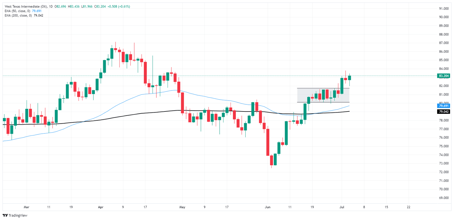 Crude Oil markets initially balked on Wednesday before an EIA-fueled rally, with WTI backsliding to $81.00 per barrel after the US reported a broad miss in key economic figures. ADP Employment Change eased to 150K from the previous 157K, Initial Jobless Claims ticked up to 238K for the week ended June 28 from 233K, and June’s USM Services Purchasing Managers Index (PMI) tumbled to a multi-year low of 48.8 compared to the previous month’s 53.8.