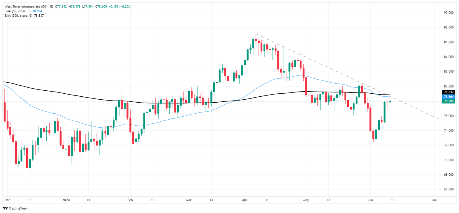 West Texas Intermediate (WTI) US Crude Oil rose through Wednesday’s early trading, hitting a fresh June high near $79.00 per barrel before slumping back below $78.00 after the Energy Information Administration (EIA) reported another buildup in US Crude Oil supplies coupled with another Federal Reserve (Fed) rate hold.