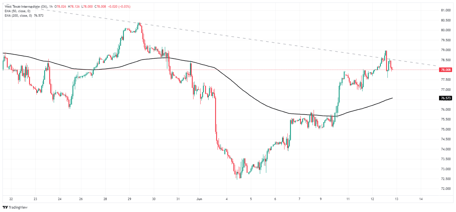 - WTI peaked near $79.00 per barrel before falling back into the day’s range.