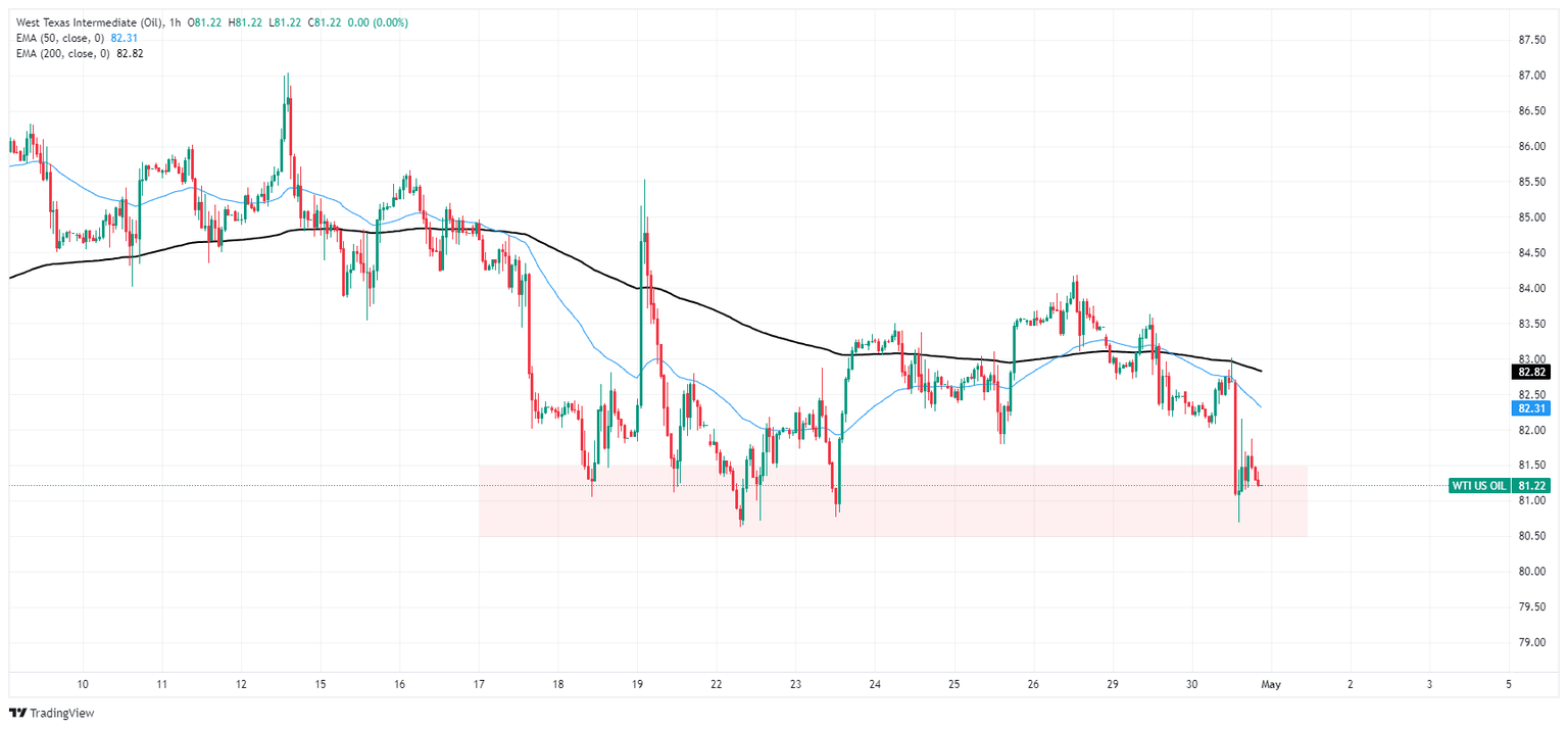 WTI has fallen back to a familiar supply zone near $81.00 as bullish momentum in US Crude Oil remains limited. WTI pivoted into a selloff after failing to hold onto the $84.00 level last week, and a pattern of lower highs is plaguing the technical chart since the last swing high peaked near $87.00 at the beginning of April.