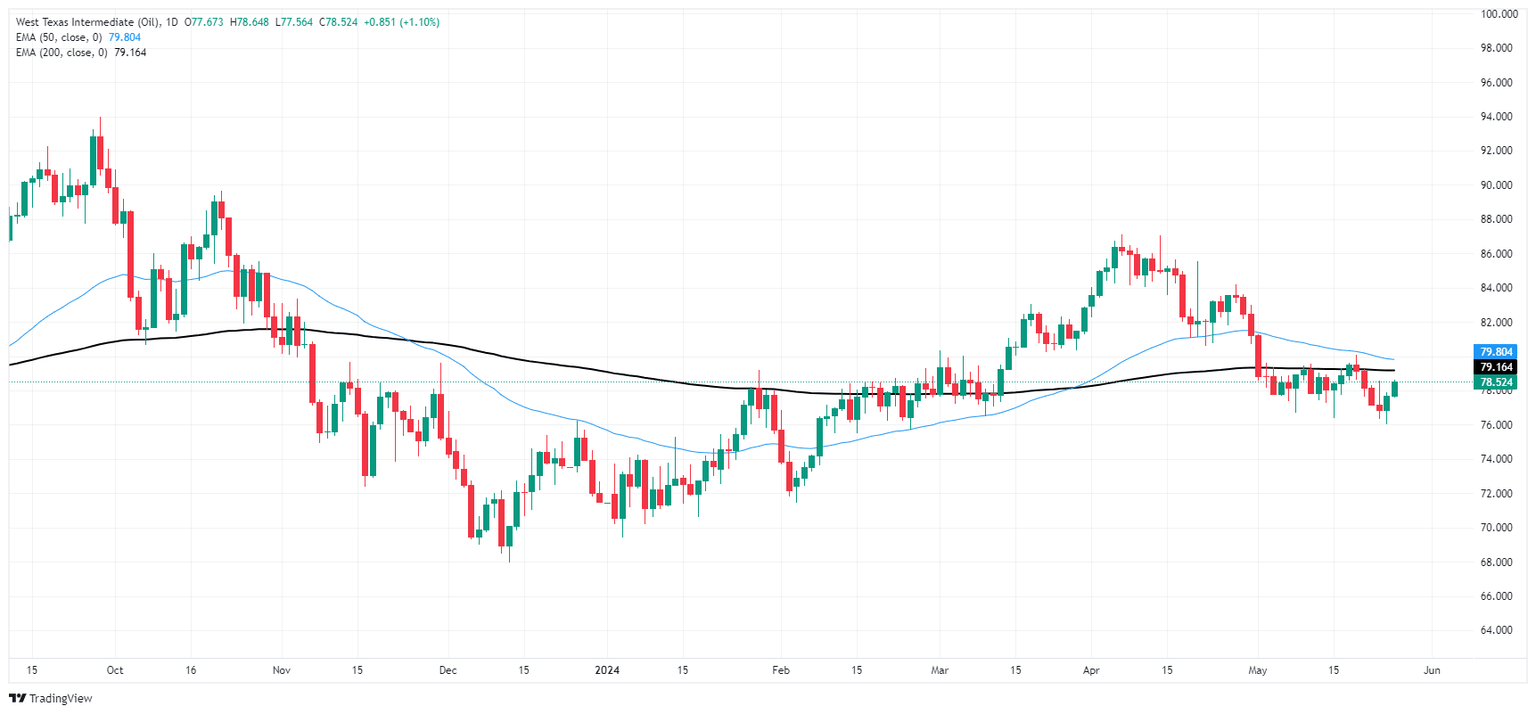 West Texas Intermediate (WTI) US Crude Oil continued to gain on Monday, climbing above $78.50 per barrel. Crude Oil is climbing with US markets dark for the Memorial Day holiday, and risk appetite is leaning into the high side as investors look for signs of Federal Reserve (Fed) rate cuts to help bolster Crude Oil.