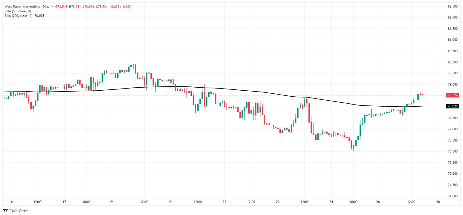 US Crude Oil rebounded on Monday, extending a near-term rebound from the $76.00 handle, however, bullish momentum faces immediate technical resistance at the $80.00 price level. A recovery in WTI sends prices back into recent congestion on the lower bound of the 200-day Exponential Moving Average (EMA) at $79.16.