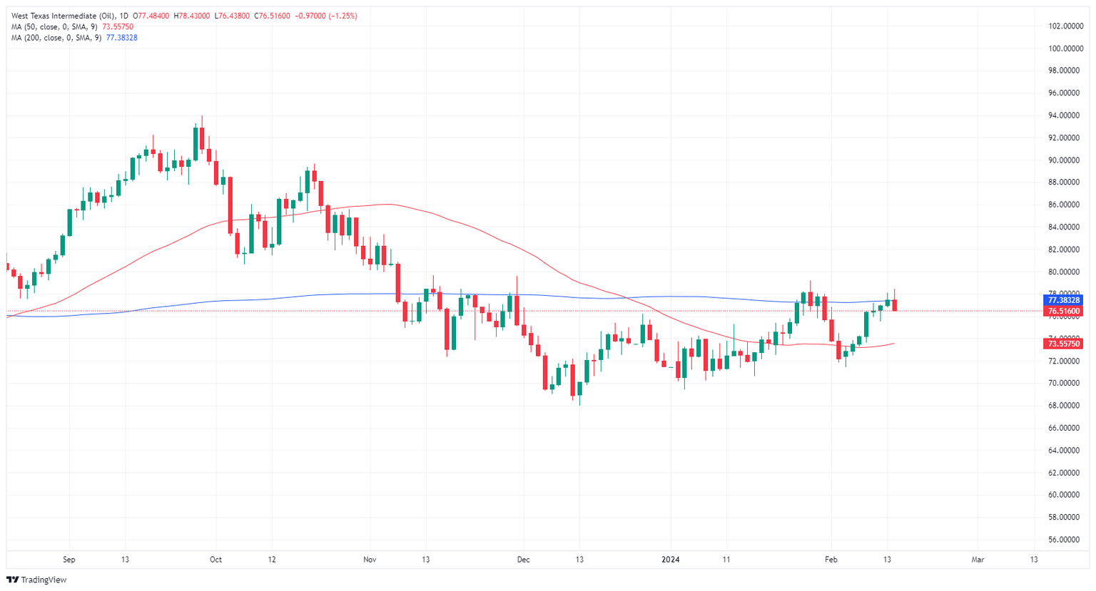 Wednesday’s pullback sees US Crude Oil forming a bearish rejection from the 200-day Simple Moving Average (SMA) near $77.40, and WTI is at risk of continuing to churn within a consolidation zone between the 200-day SMA and the 50-day SMA near $73.55.