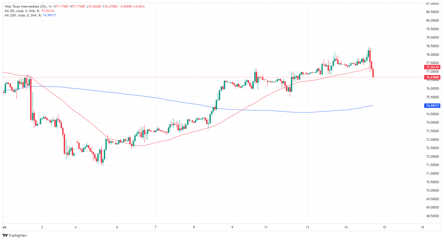 Crude Oil tests multi-week high before receding on supply buildup, WTI back below $77.00