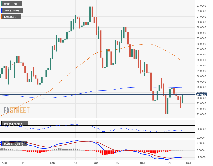 Tuesday's risk bid is seeing Crude Oil step higher with the WTI bidding into the $77.00 handle late in the day, but with daily candlesticks continuing to get capped off by the 200-day Simple Moving Average (SMA) near $78.00, upside momentum could remain limited.