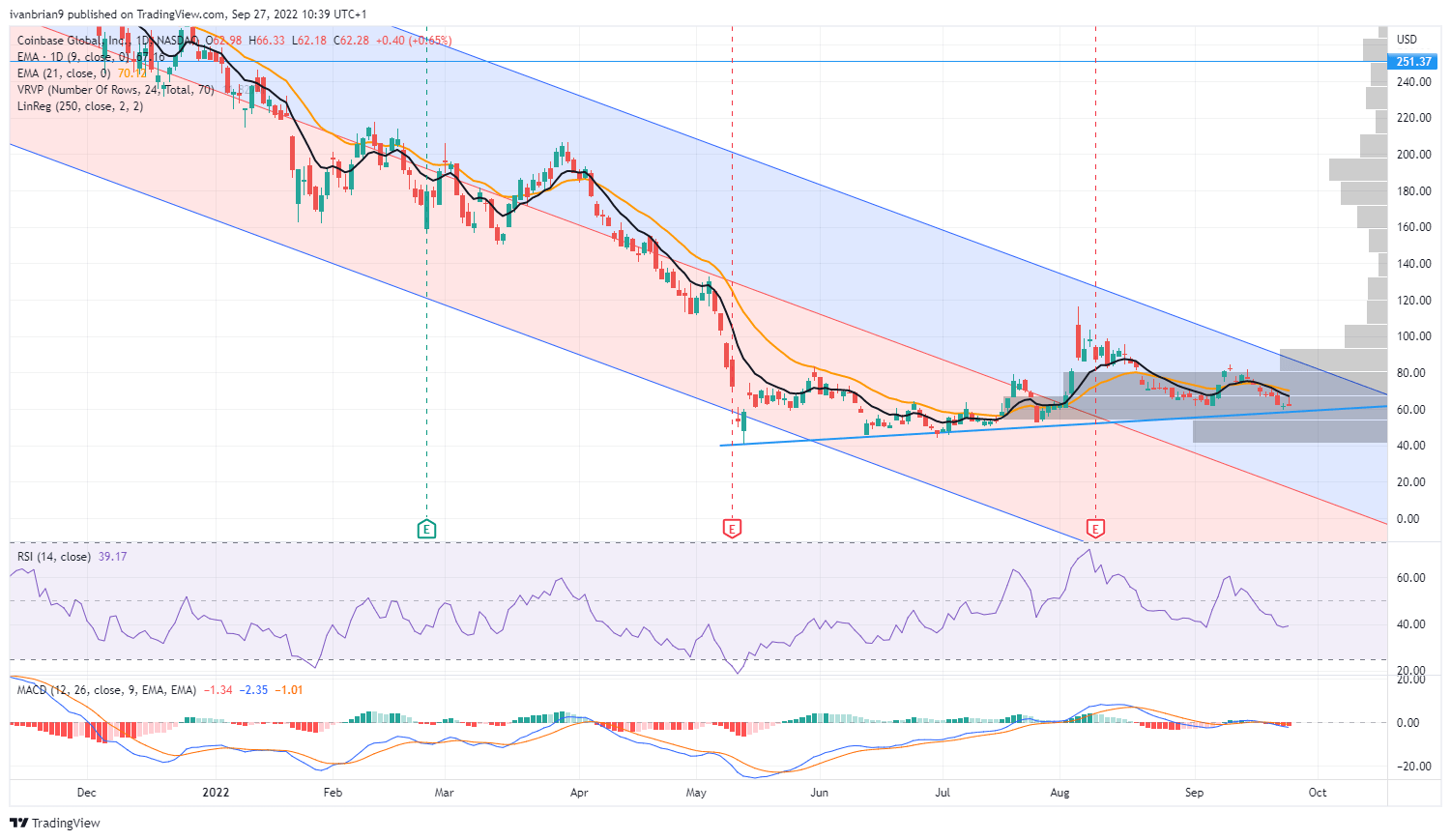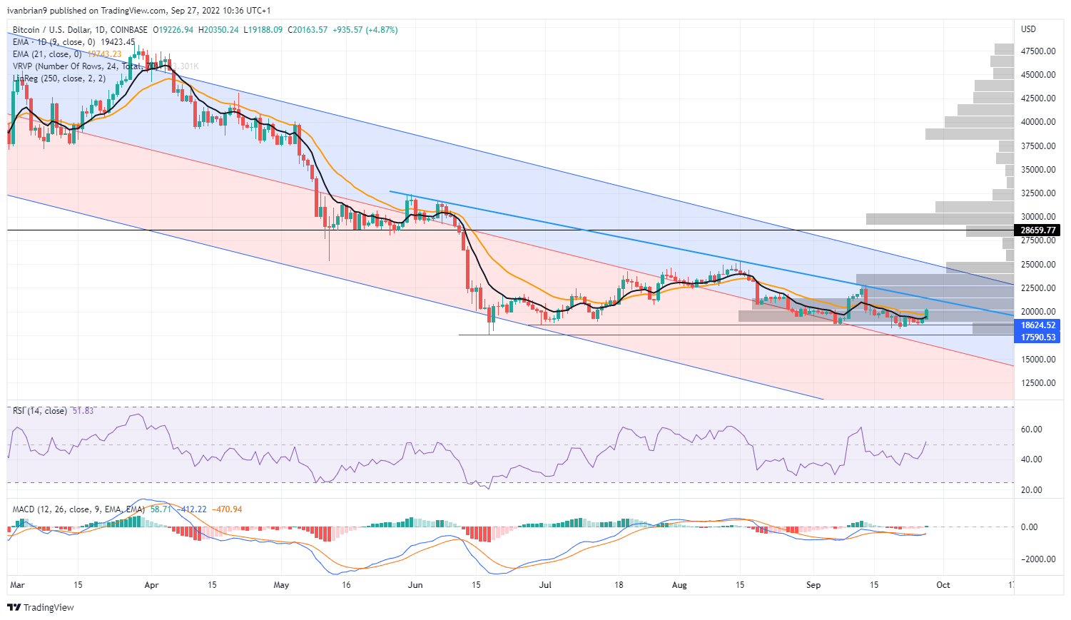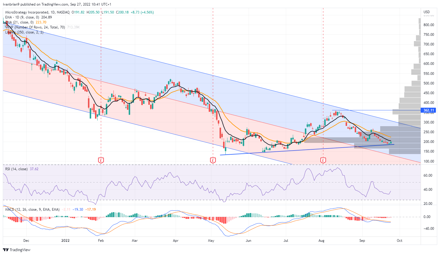 Monday saw the beginning of the crypto recovery with COIN stock up. MSTR stock closed at $200.18 for a gain of over 4%, while RIOT and MARA were also higher. Let's not forget others in the space such as BBIG, which also closed higher. There is little to report on an individual level for any of the above stocks. Tuesday could and should see more gains based on the move in Bitcoin. The failure to break below $18,600 meant a test of ultimate lows at $17,590 was unlikely. The next test is the trendline at $21,400 and then $22,800, which is the high from September 13.