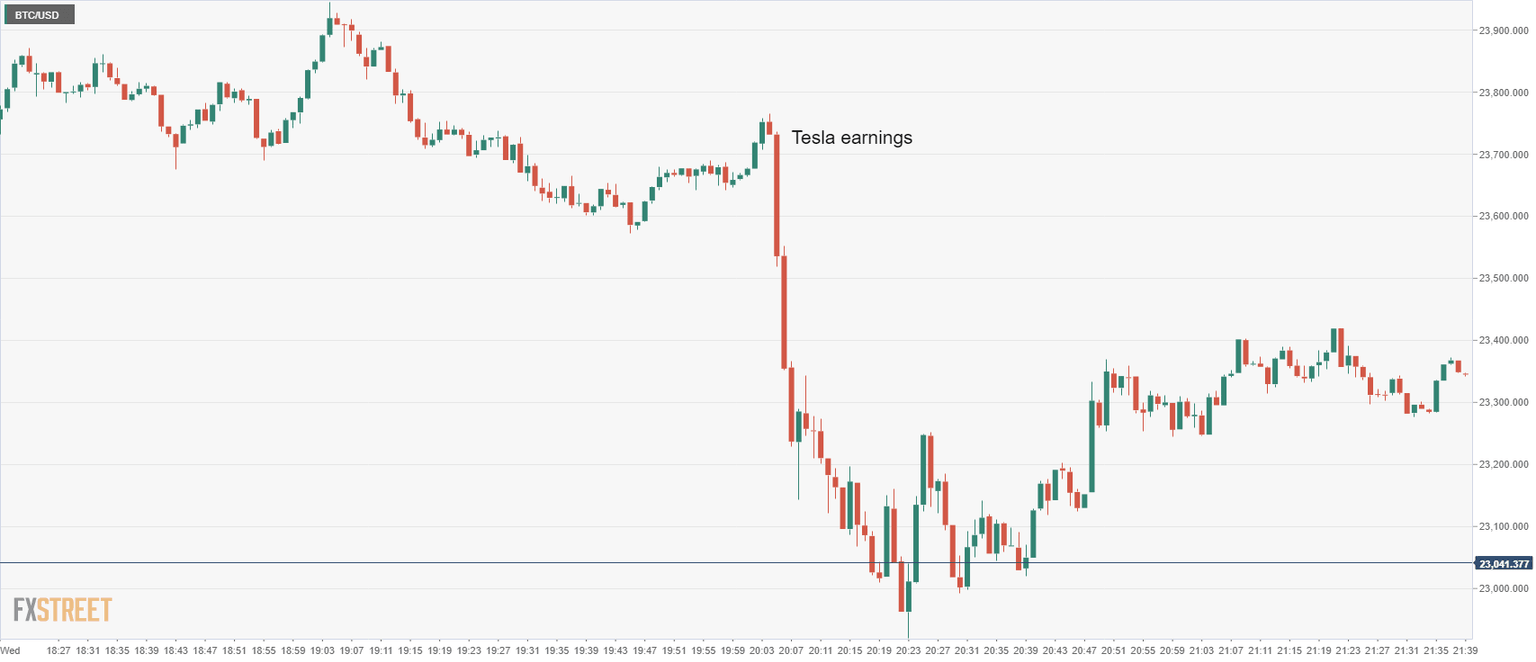 After the close Tesla reported quarterly earnings that beat on earnings per share (EPS) and was mostly in line on revenue. The finer details showed this EPS beat was helped by Tesla selling most of its Bitcoin holdings last quarter. Elon Musk has been a vocal proponent of the crypto space, and this news was enough to send Bitcoin lower by $700 as we can see below. This pressure has continued through to Thursday with Bitcoin down at $23,000 currently. Michael Saylor must have been thanking Elon for that one!