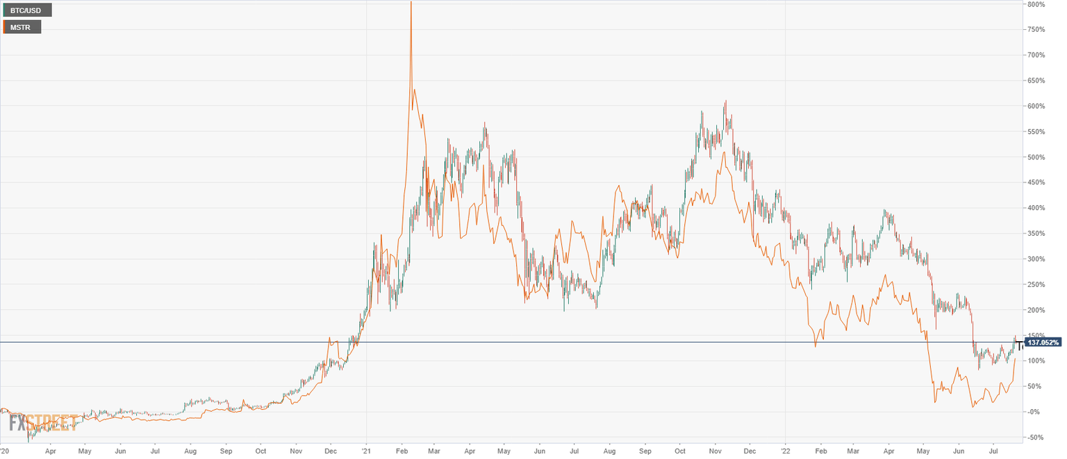 Bitcoin (orange line) with MSTR stock, daily