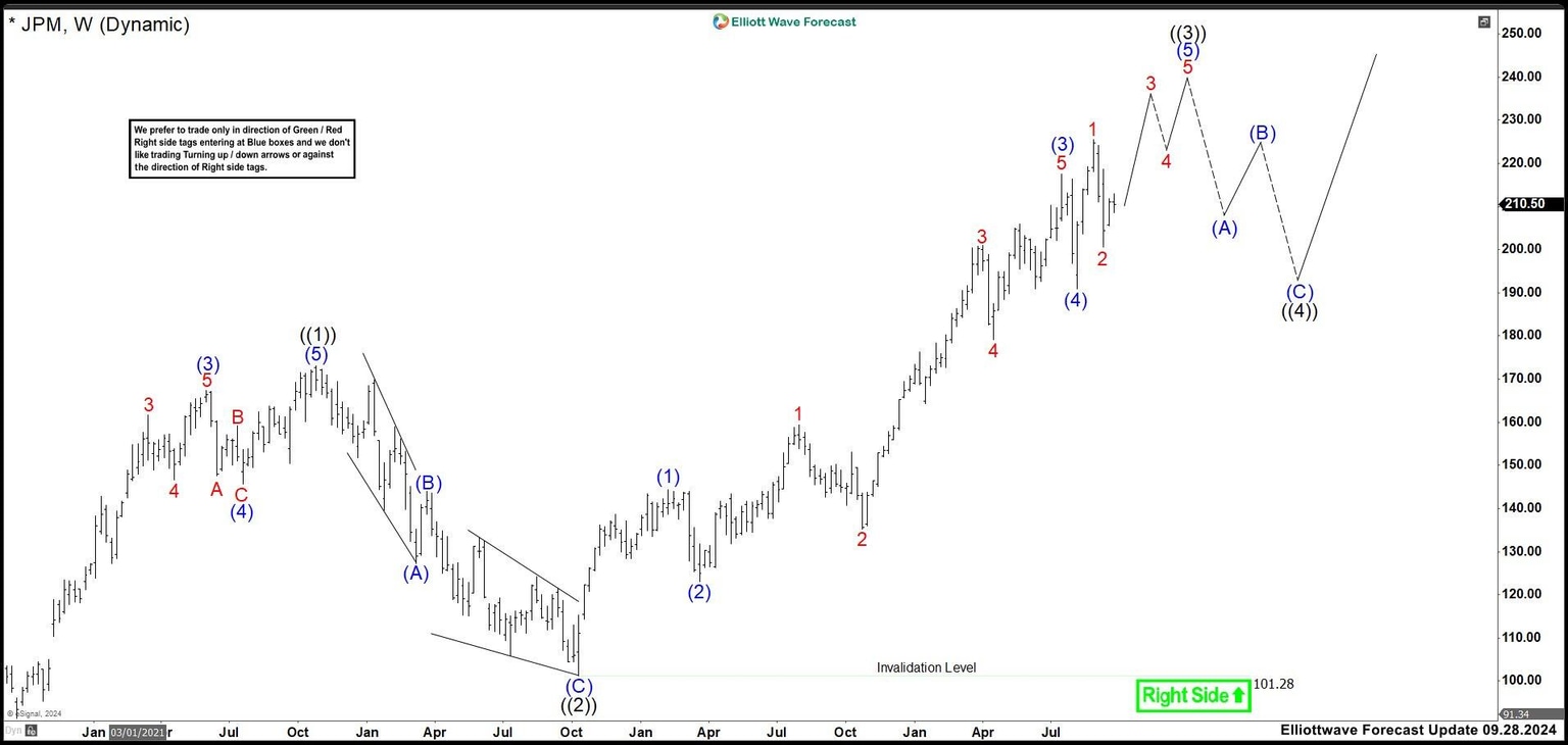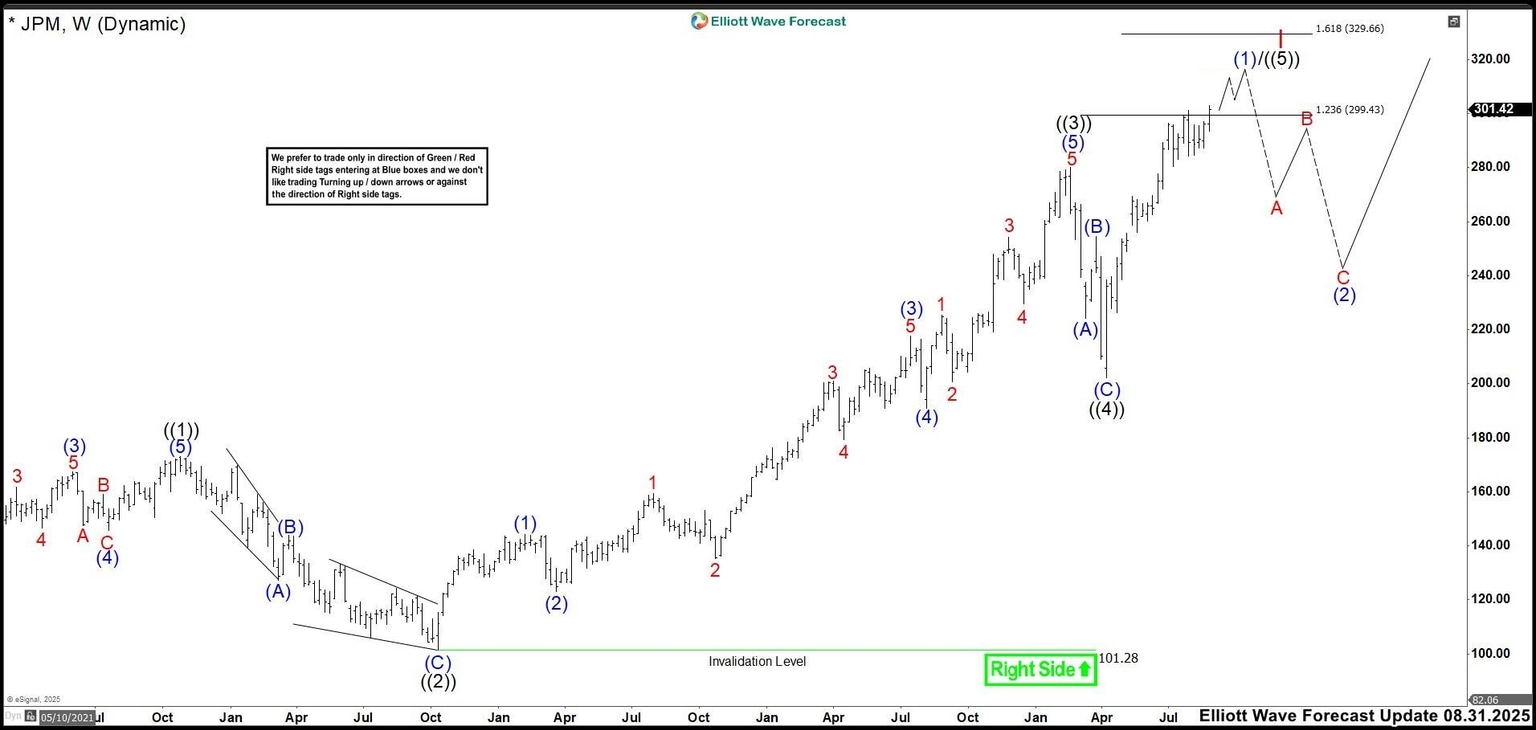 In this latest update, we observe that wave (5) of ((3)) extended to 280.25 high, completing wave ((3)). This was followed by a zigzag correction as wave ((4)), which found its bottom in April. From here, we see two possible scenarios: First, JPM could build a full impulsive structure to complete wave ((5)), finalizing the entire cycle as wave I. This would imply a deeper correction toward the 160–200 zone as wave II before resuming the bullish trend. The second scenario, which we are currently favoring, suggests the market is forming an extended wave ((5)). In this case, the rally from April would mark wave (1) of ((5)), and once the impulse ends, a corrective wave (2) could bring prices down to the 260–240 area before continuing higher.