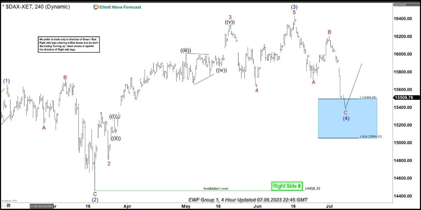 Hello fellow traders. In this article we’re going to take a quick look at the Elliott Wave charts of DAX published in members area of the website. DAX is showing impulsive bullish sequences in the cycle from the September 2022 low. Recently we got a 3 waves pull back that has ended right at the Blue Box zone (our buying area). In the further text we are going to explain the Elliott Wave Forecast and trading setup.