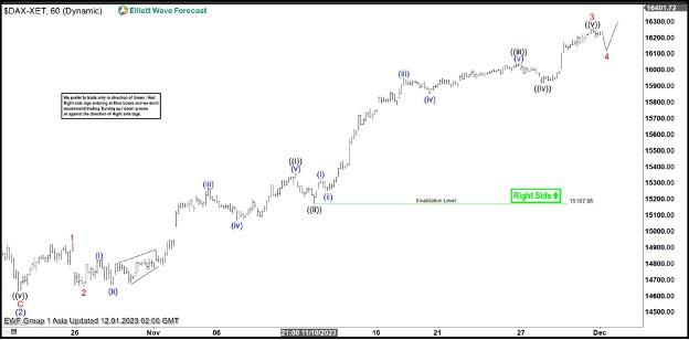 DAX cycle from 9.29.2022 low is in progress as a 5 waves impulse Elliott Wave structure. Up from 9.29.2022 low, wave (1) ended at 16528.97 and dips in wave (2) ended at 14630.21. The Index extends higher again in wave (3). It still needs to break above wave (1) at 16528.97 to validate this view and opens up a bullish sequence.