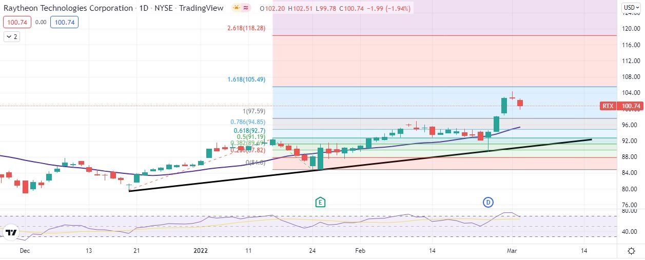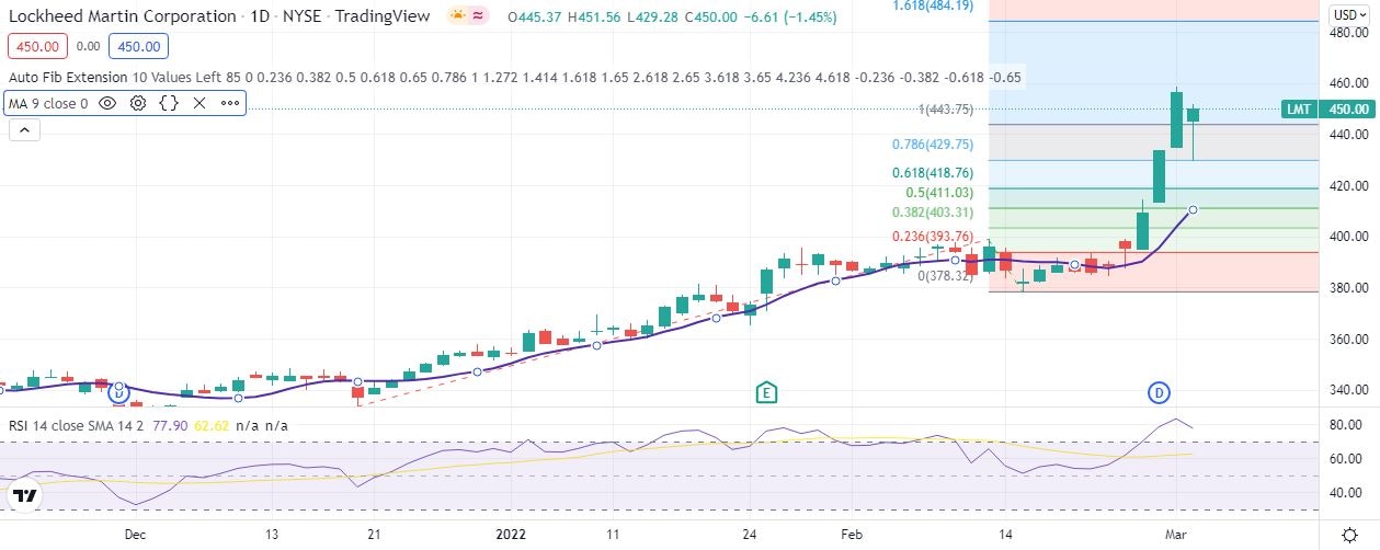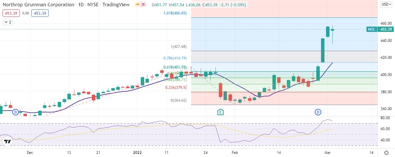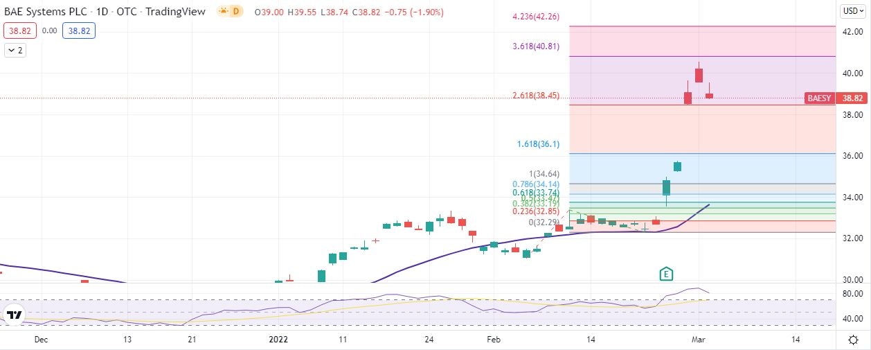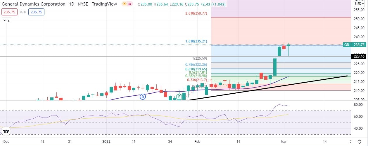 Read below for further specifics on five major defense contractors benefitting from the new focus on military spending. In each case, FXStreet shows the Fibonacci extension levels that may come in handy in order to take profit.
