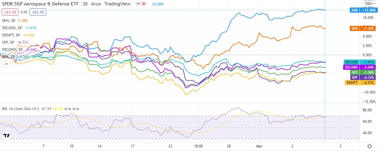 With all this renewed interest in buying military hardware, it is no wonder that the S&P 500 Aerospace & Defense Index ETF (XAR) is booming. Shares are up more than 12% at the same time that most sectors are down. The S&P 500 (SPX) is down -3.4% over the same period.