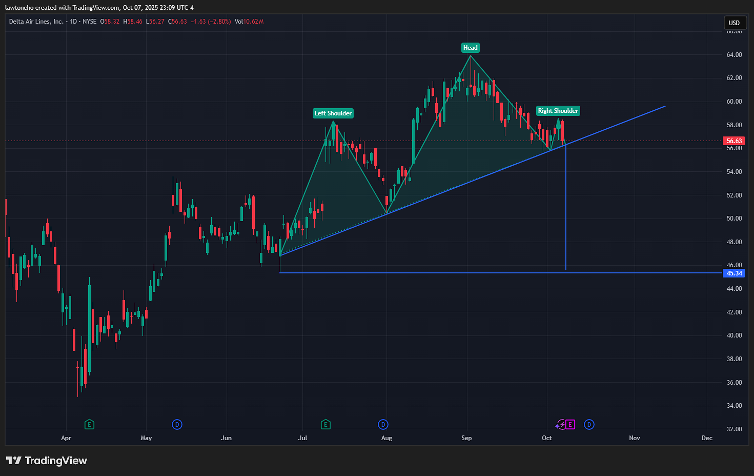 Delta Air Lines (DAL) reports earnings on Thursday morning. Heading into the print, I’m focused on the technicals: the chart is showing a head and shoulders pattern. I draw the neckline from the end of June through the lows of July into where price is now. Although the right shoulder is smaller, the structure remains valid in my book, and I’m treating it with respect going into the event.