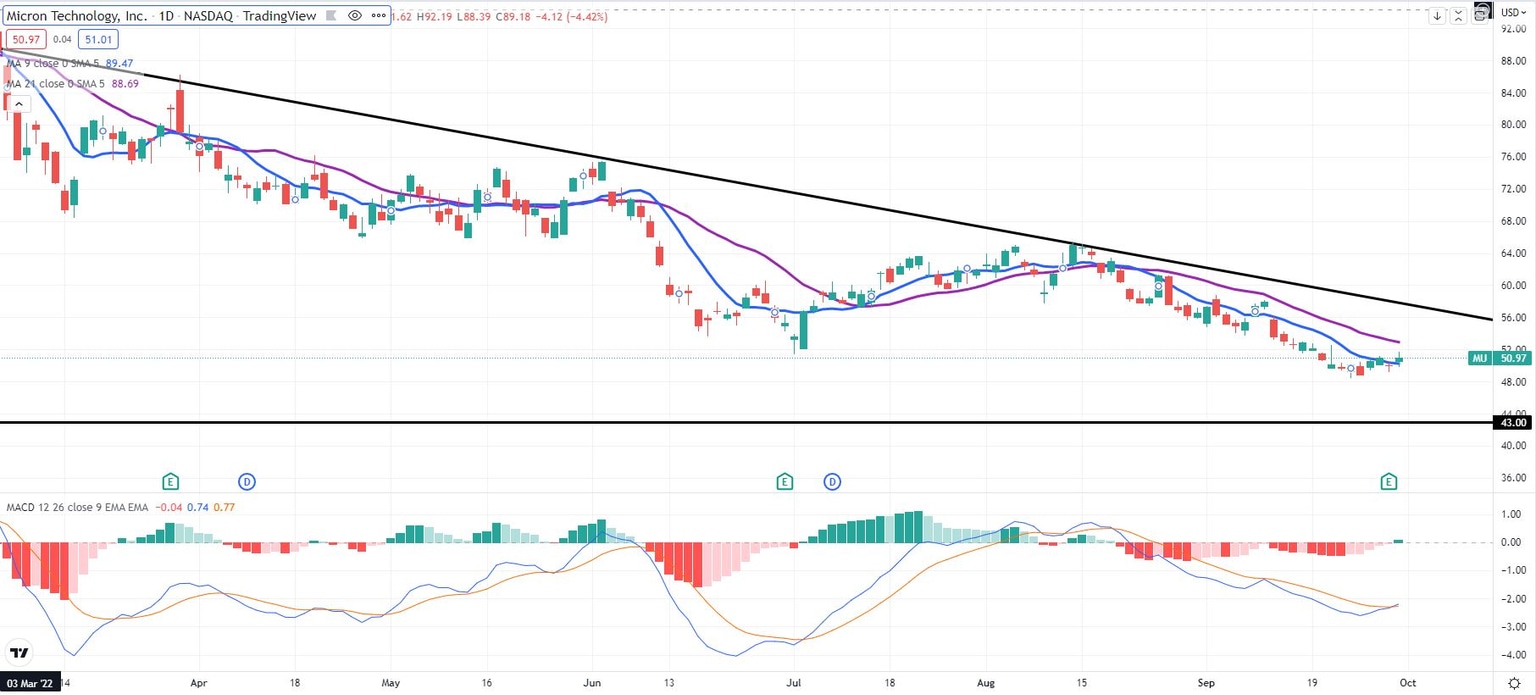 More significantly the daily chart below shows that MU stock was at the bottom of its cycle, and the Moving Average Convergence Divergence (MACD) indicator seems to be showing a bullish crossover. With the share price already above the 9-day moving average, the 21-day moving average at $53 could offer resistance. This seems unlikely though since it is so close and Micron's earnings release is behind it. A break above the 21-day will send it up toward the descending top trendline.