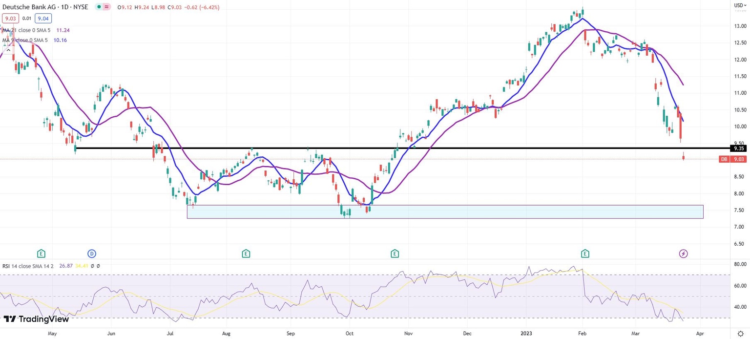 Breaking through the $9.35 support level seen during last August and September's double top formation means that Deutsche Bank stock is likely headed for the mid-$7 range. That demand zone held up in the latter of 2022 between $7.25 and $7.66. There is minimal support at $8, but the lower range provides much stronger historical support as it witnessed much more volume months apart. If, however, DB stock breaks back above $9.35, then the stock would appear to be in an uptrend. Bulls entering here will want to make sure there are at least two closes above that level before getting in themselves.