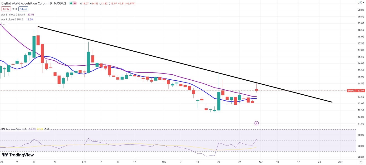 DWAC bulls primarily need to contend with the descending trendline, which is now around $14.50. This gives DWAC a price level to beat before further upside is considered to be in the cards. If DWAC fails to break above this trendline, it will soon fall back to $13 for support.