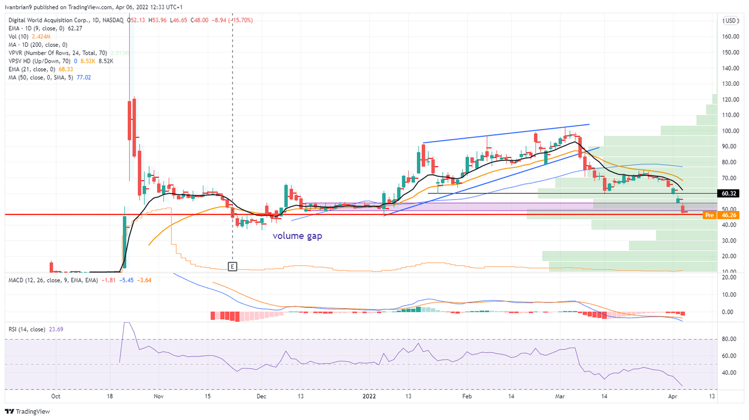 Momentum has dried up significantly. There is probably a huge marketplace for the view of former President Trump given he had a huge Twitter following and this was evidenced in the enormous frenzy that drove DWAC stock from $12 to $175 in two days back in October. We identified the consolidation zone around $50 as support and it looks now that DWAC stock will solidly break this level. That brings $39.31 into view as the next support level. $60.32 remains the key resistance.