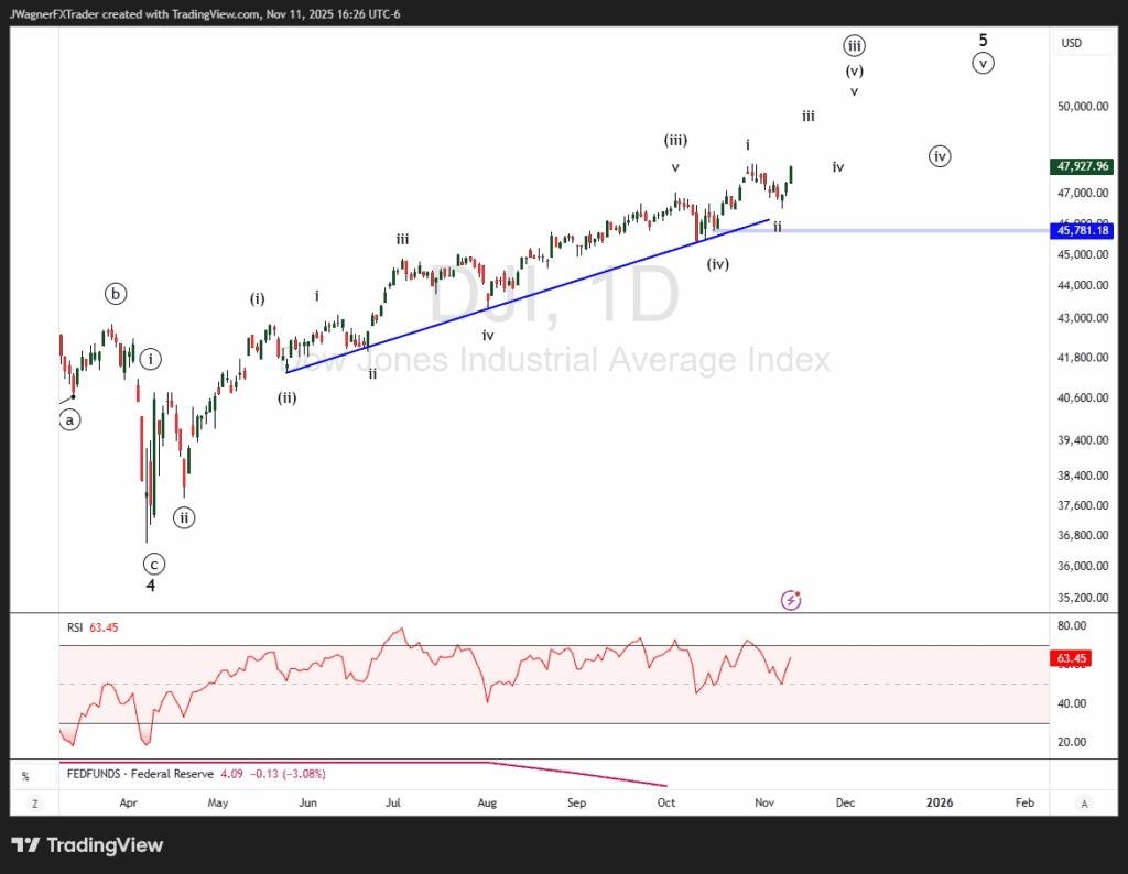 The DJI is progressing within an Elliott wave three of a larger 5-wave trend.