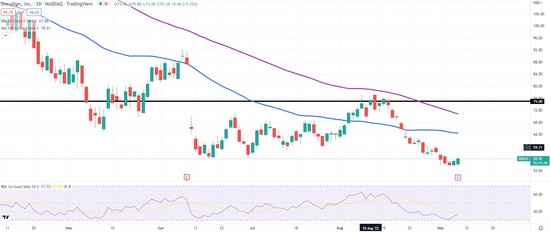DOCU stock has been in a depressed state since the prior earnings call, so it needs a good result to break out of this funk. Better than expected guidance or a sizable EPS beat could send shares up by about $10. Any rally would likely get caught at resistance near the 50-day or 100-day moving averages however. The 50-day is at $64.40, and the 100-day is around $70.80.