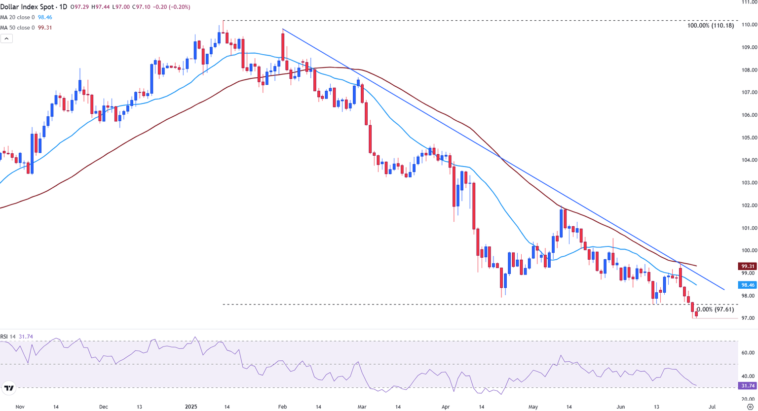 At the time of writing, DXY is trading near 97.05, extending its multi-month downtrend and remaining well below both the 20-day (98.46) and 50-day (99.31) Simple Moving Averages (SMA).