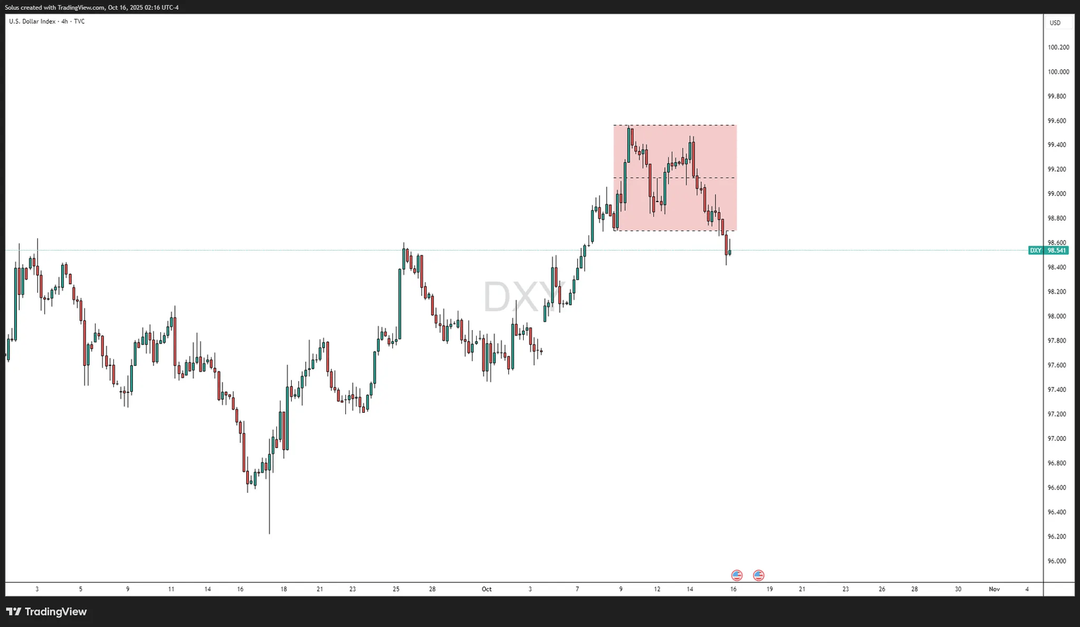 The U.S. Dollar Index just broke below a crucial consolidation range (99.60 – 98.90), signaling a loss of momentum that coincides with growing fiscal dysfunction.