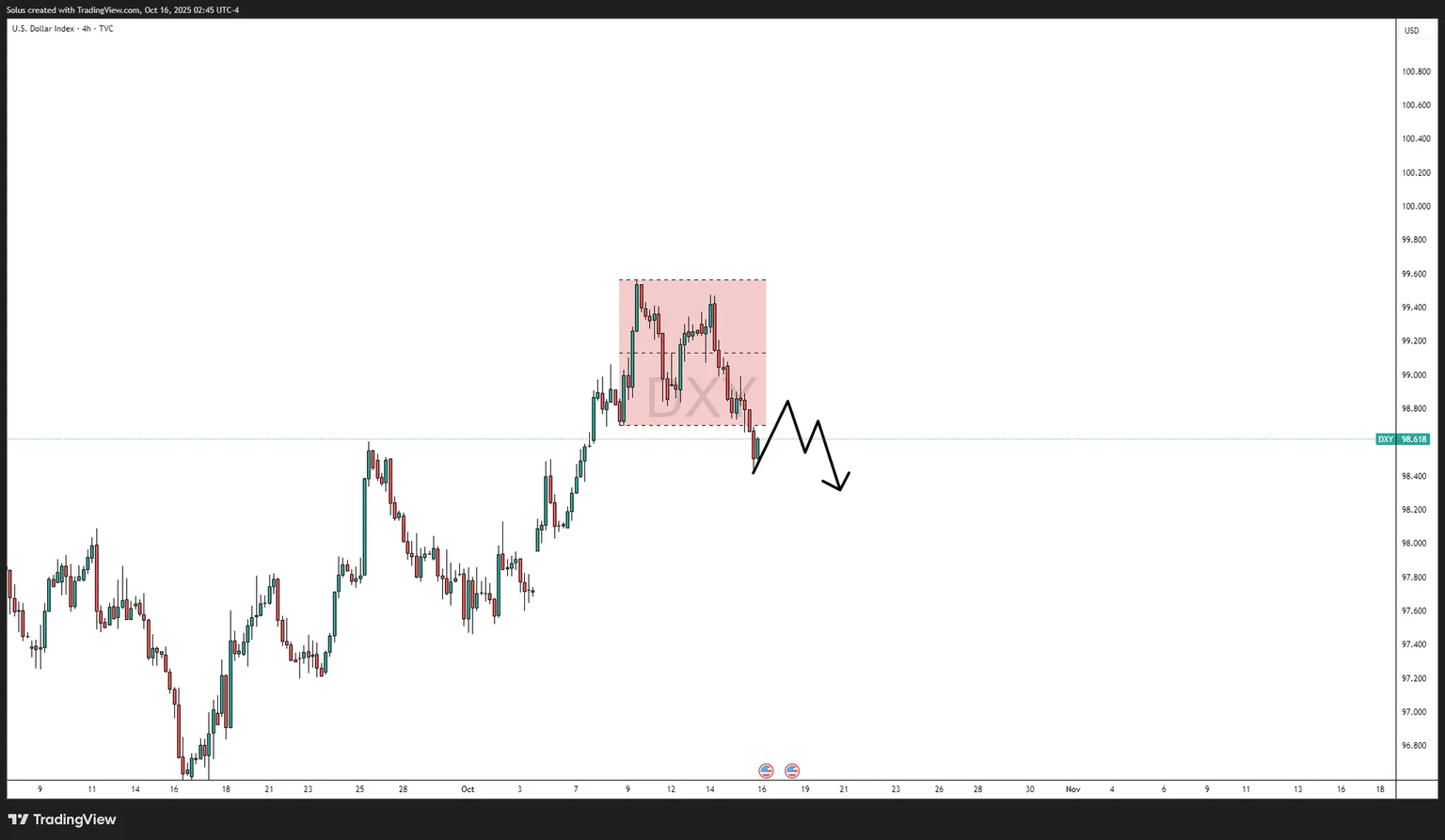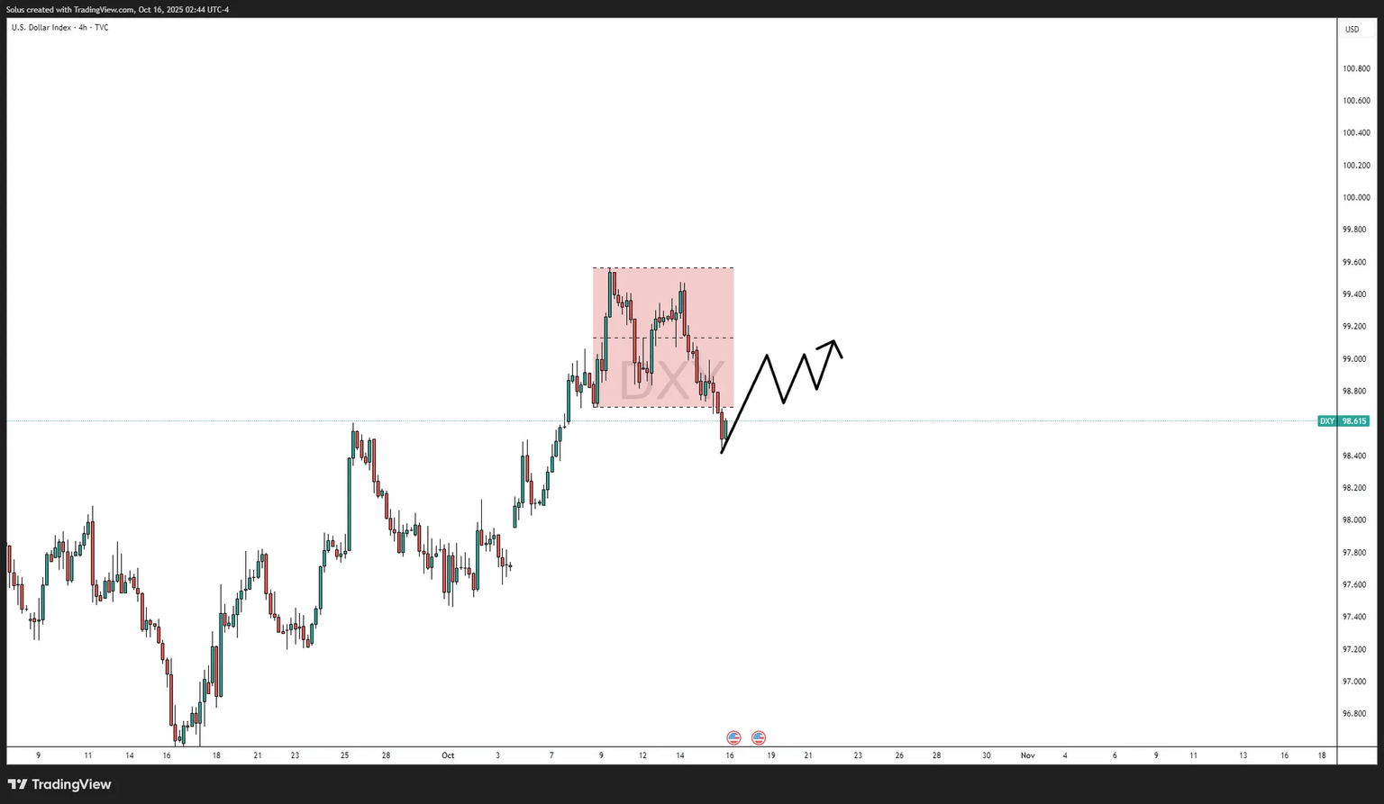 If DXY closes back above 99.00–99.20, it could spark a relief rally toward 99.60–99.80, signaling that the U.S. is “back online.”