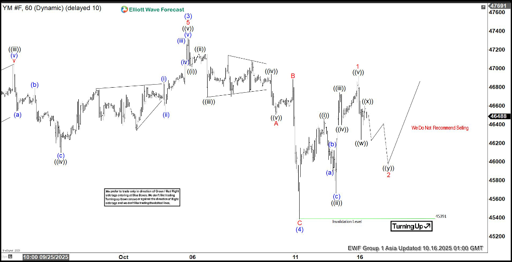The short-term Elliott Wave outlook for Dow Futures (YM) indicates that the cycle from the April 2025 low continues as a five-wave impulse. As shown in the 1-hour chart, wave (3) of this impulse peaked at 47,323. The subsequent wave (4) pullback unfolded as a zigzag Elliott Wave structure. From wave (3), wave ((i)) declined to 47,014, followed by a wave ((ii)) rally to 47,162. Wave ((iii)) dropped to 46,693, wave ((iv)) rose to 46,938, and wave ((v)) concluded at 46,507, completing wave A. Wave B bounced to 46,883, and wave C extended lower to 45,391, finalizing wave (4) in the higher degree.