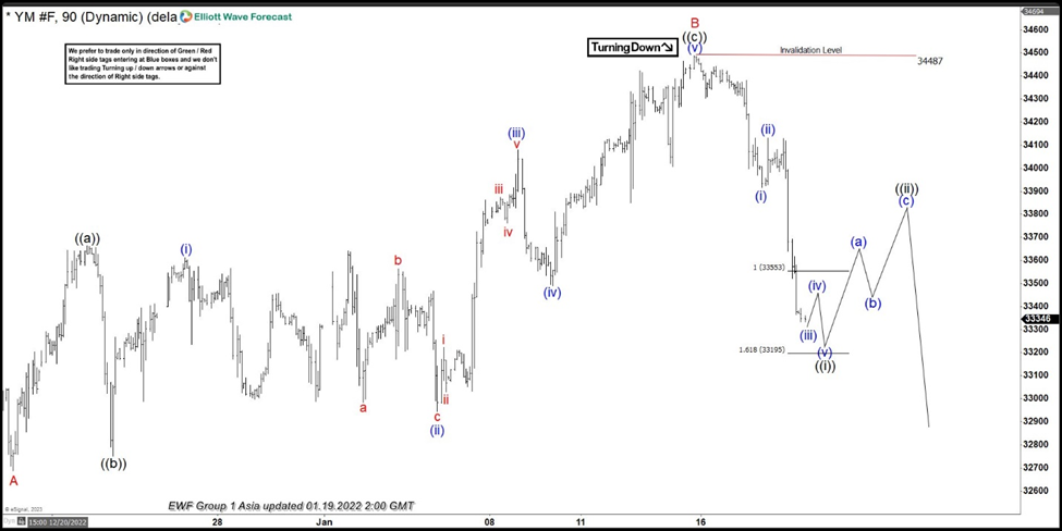 Cycle from 12.13.2022 high in Dow Futures (YM) is unfolding as a zigzag Elliott Wave structure. Down from 12.13.2022 high, wave A ended at 32686. Wave B rally ended at 34487 as the 90 minutes chart below shows. Internal subdivision of wave B unfolded as a zigzag structure in lesser degree. Up from wave A, wave ((a)) ended at 33663 and dips in wave ((b)) ended at 32750. Index then extended higher in wave ((c)) as a 5 waves diagonal. Up from wave ((b)), wave (i) ended at 33613 and dips in wave (ii) ended at 32943. Wave (iii) ended at 34080, wave (iv) ended at 33489, and final leg higher wave (v) ended at 34487 which completed wave ((c)) and B in higher degree.