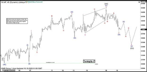 Short Term Elliott Wave in Dow Futures (YM) suggests the decline from 7.27.2023 high has ended with wave (W) at 33014. The Index is now correcting that cycle in wave (X) with internal subdivision as a double three Elliott Wave structure. Up from wave (W), wave (i) ended at 33410 and pullback in wave (ii) ended at 33032. Index then resumed higher again in wave (iii). Up from wave (ii), wave i ended at 33756 and wave ii dips ended at 33298. Index resumes higher again in wave iii towards 34092 and pullback in wave iv ended at 33799. Final leg higher wave v ended at 34153 which completed wave (iii). Pullback in wave (iv) ended at 33617.