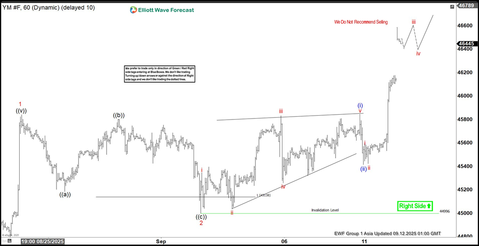 The short-term Elliott Wave analysis for Dow Futures (YM) indicates a cycle from the 1 August 2025 low is forming an impulse. The wave 1 peaked at 45,841, followed by a wave 2 pullback that ended at 44,996. Wave 2’s internal structure developed as a zigzag. From wave 1’s peak, wave ((a)) dropped to 45,183, and wave ((b)) rose to 45,801. Wave ((c)) then fell to 44,996, completing wave 2 at a higher level. The index now trends upward in wave 3.