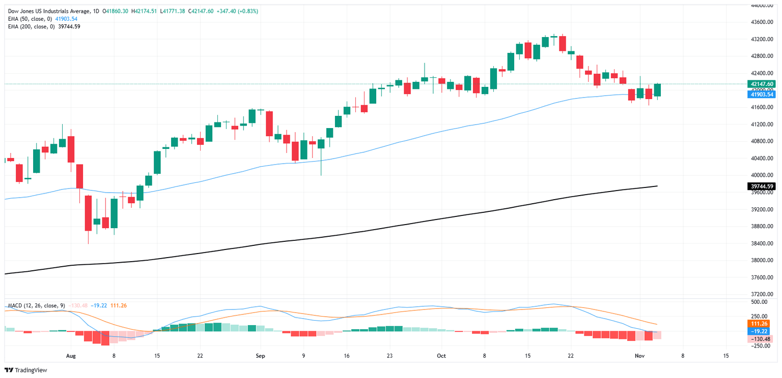 The Dow Jones Industrial Average (DJIA) gained ground on Tuesday, climbing around 400 points to add nearly a full percent to its top-line. The major equity index is bumping into the ceiling of a near-term consolidation range as investors brace for the outcome of the US election as US voters head to the polls.