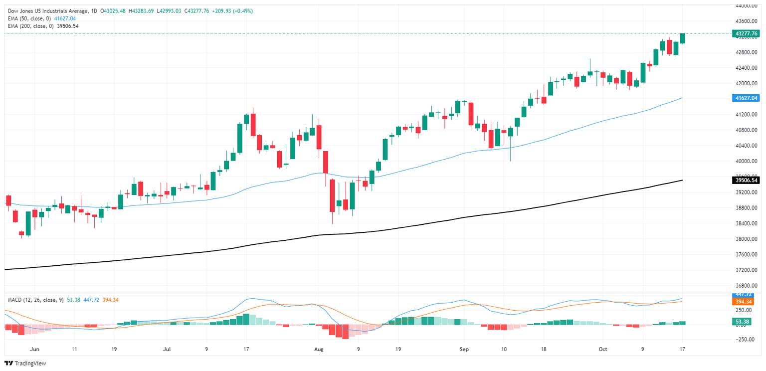 The Dow Jones continues to grind out chart paper on the high end, clipping new all-time highs above 43,250 and extending 2024’s bull run to nearly 15%. Bullish momentum is once again outrunning long-term averages, with the 200-day Exponential Moving Average (EMA) rising through 39,500 and struggling to catch up.