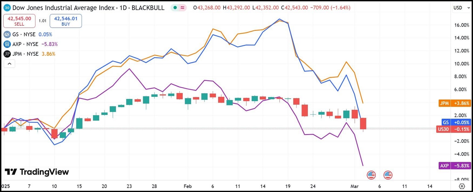 Dow Jones financials crash in unison as tariffs commence: Goldman Sachs, JPMorgan, American Express