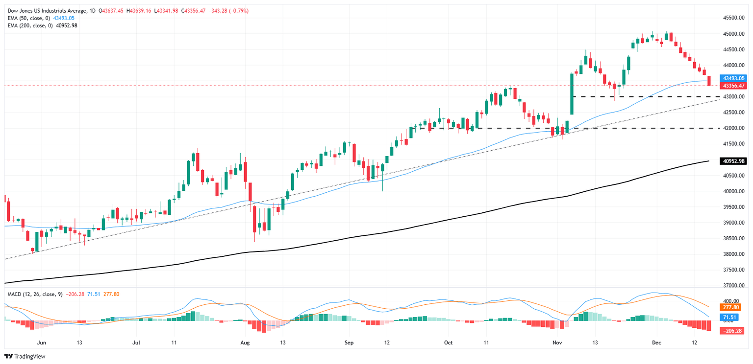The Dow Jones’ 330 point decline on Tuesday sets up the major equity index for its longest day-over-day losing streak, and the DJIA is on pace to close in the red for a ninth straight session. The Dow has pierced the 50-day Exponential Moving Average (EMA) for the first time since late October, back when price action was testing a technical floor near the 42,000 handle.