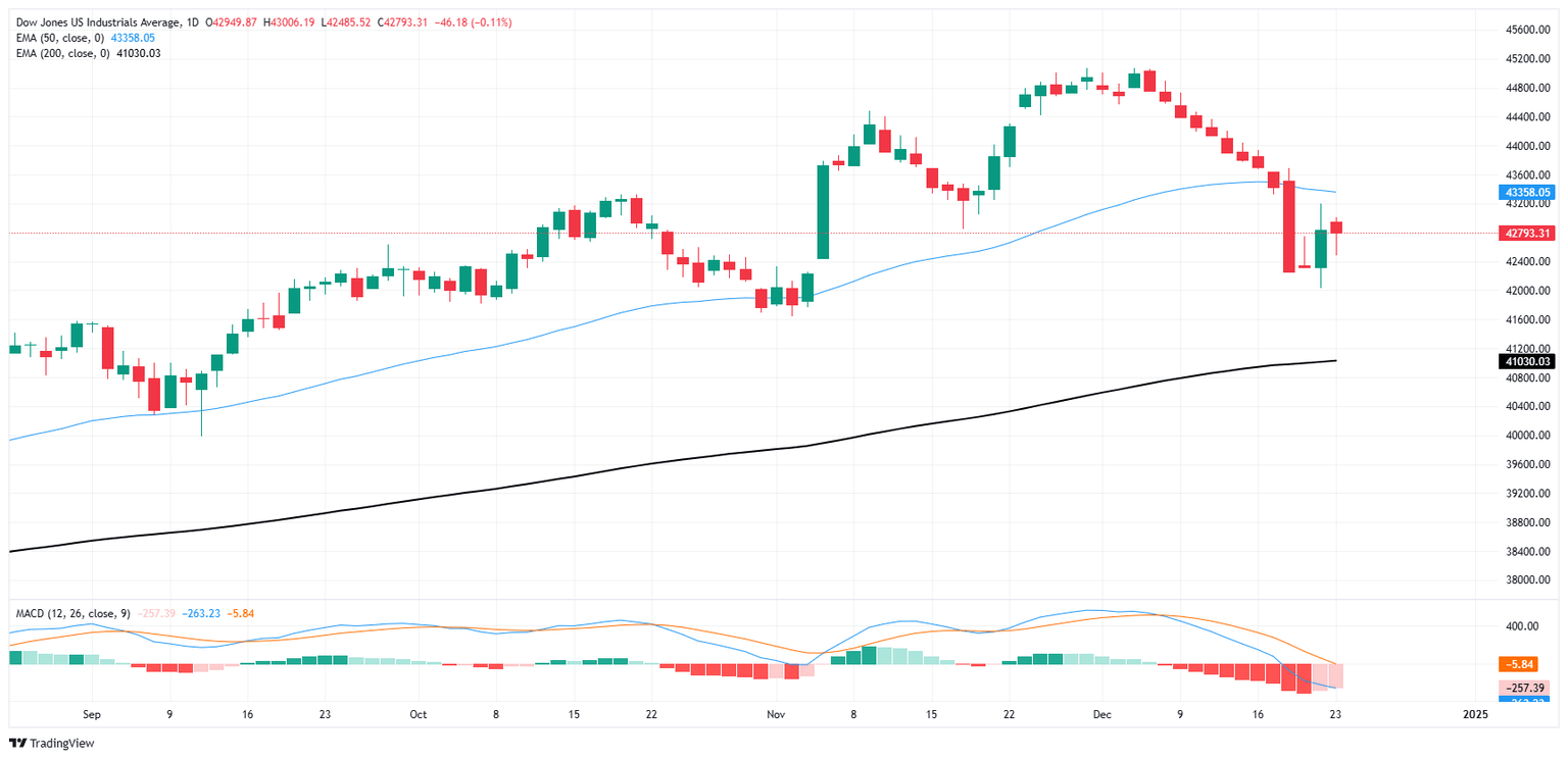 The Dow Jones Industrial Average (DJIA) weakened to kick off the Christmas trading week, falling a little over 200 points at its lowest before staging a meager recovery to -50 points on Monday. The Dow Jones is grappling with chart territory south of 43,000 following a ten-day backslide that dragged the major equity index back underneath record bids above 45,000.