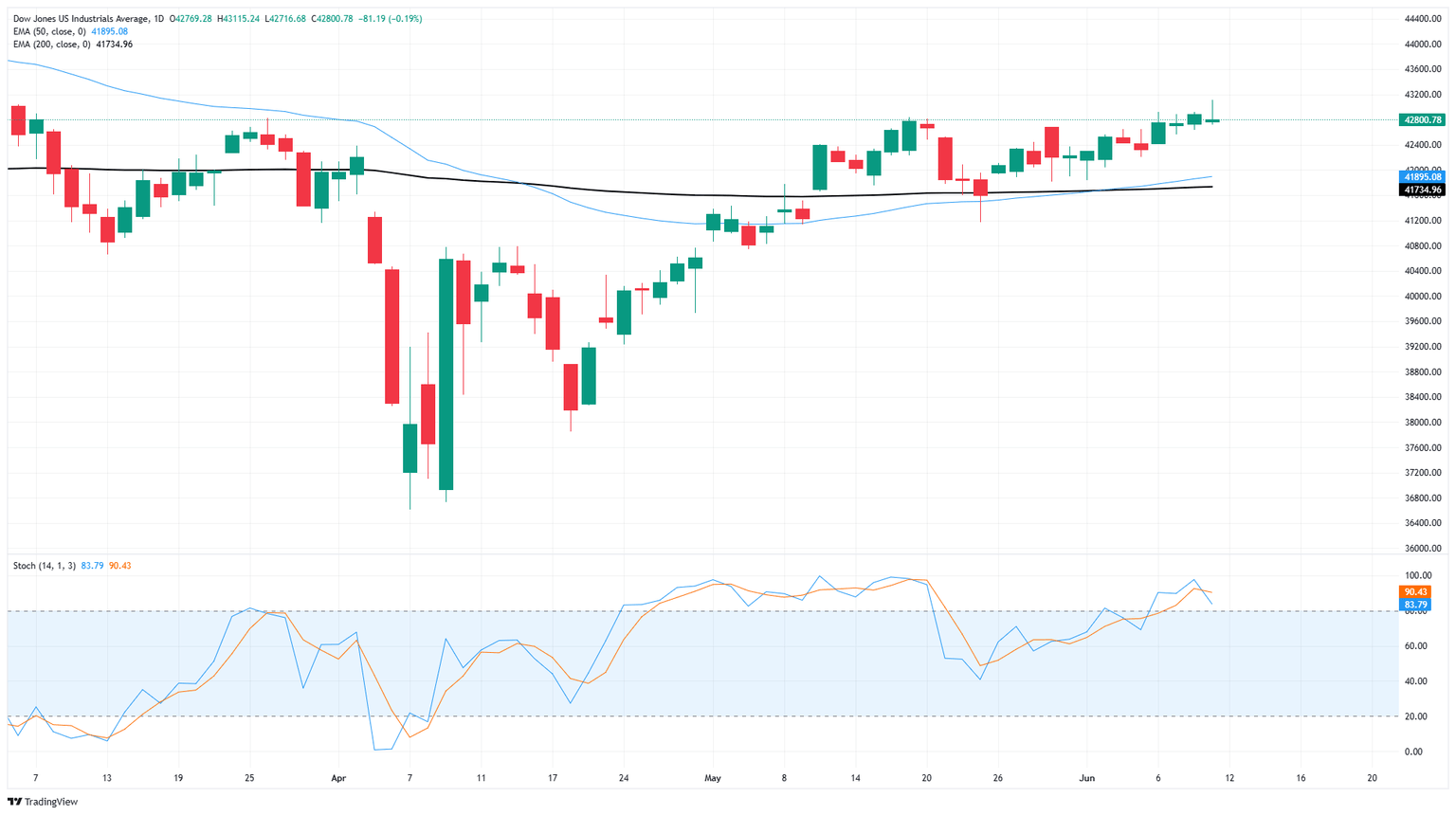 - The Dow Jones tested above the 43,000 level for the first time since February.