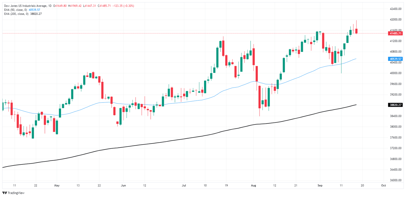 The Dow Jones flubbed Wednesday's brief peak at record highs near 41,970, settling back and end the day near 41,500 and shedding 100 points, or one-quater of one percent, in the process. The major equity board is still holding on the high end of recent bullish momentum, but a lack of sustained bidding pressure could see the Dow Jones ease back toward the 50-day Exponential Moving Average (EMA) near 40,500.