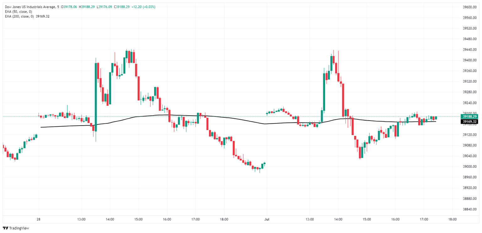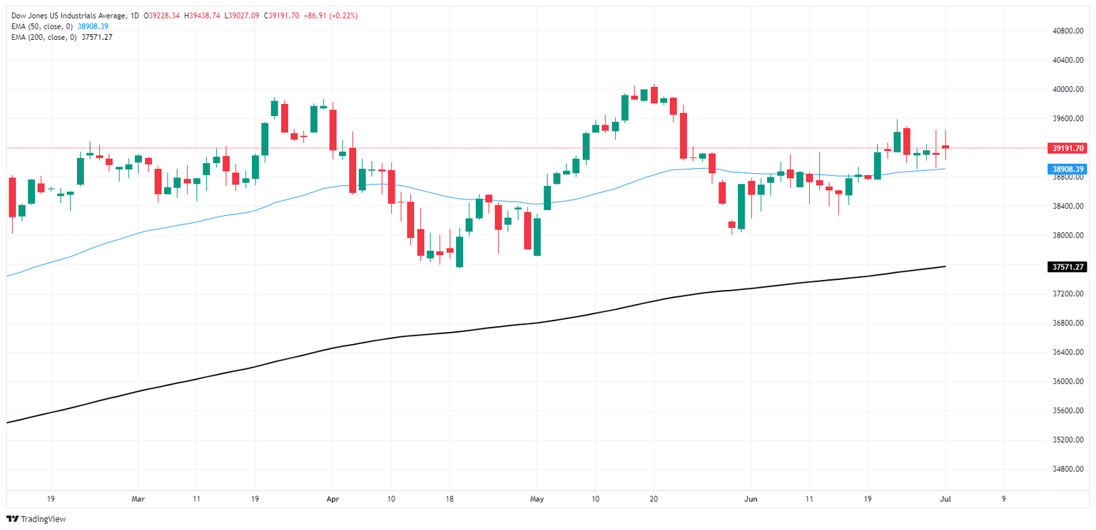 Daily candles continue to churn out a growing consolidation pattern as the Dow Jones gets strung along the 50-day Exponential Moving Average (EMA) at 38,908.22. The DJIA continues to hold on the high side of late May’s bottom near 38,000.00, but topside momentum remains unable to recover ground back to all-time highs set just north of the 40,000.00 major price handle in May.