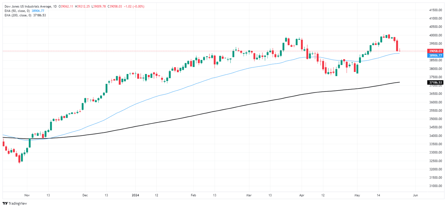 Downside momentum is running into technical support from the 50-day Exponential Moving Average (EMA) at 38,908.78. Despite near-term losses, the Dow Jones remains firmly bullish, trading deep into bull country and up 3.7% in 2024.