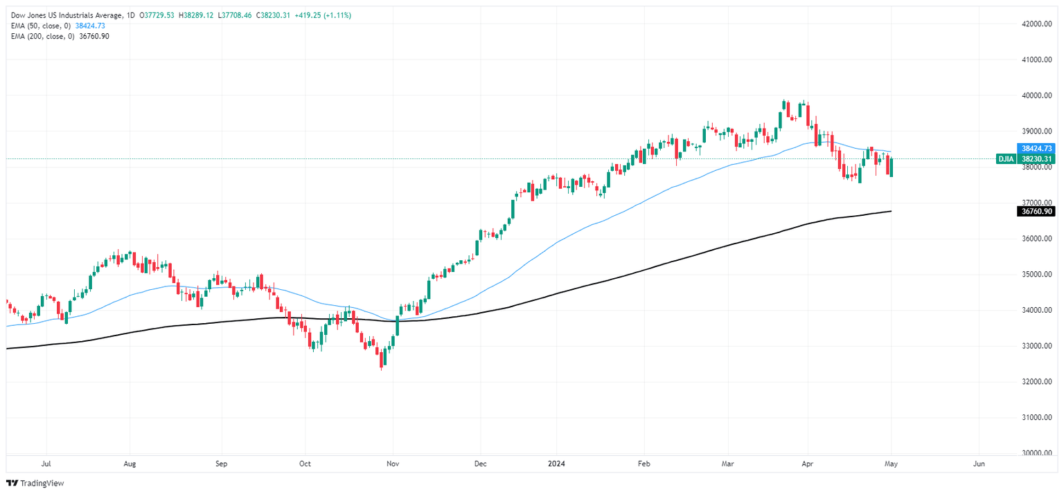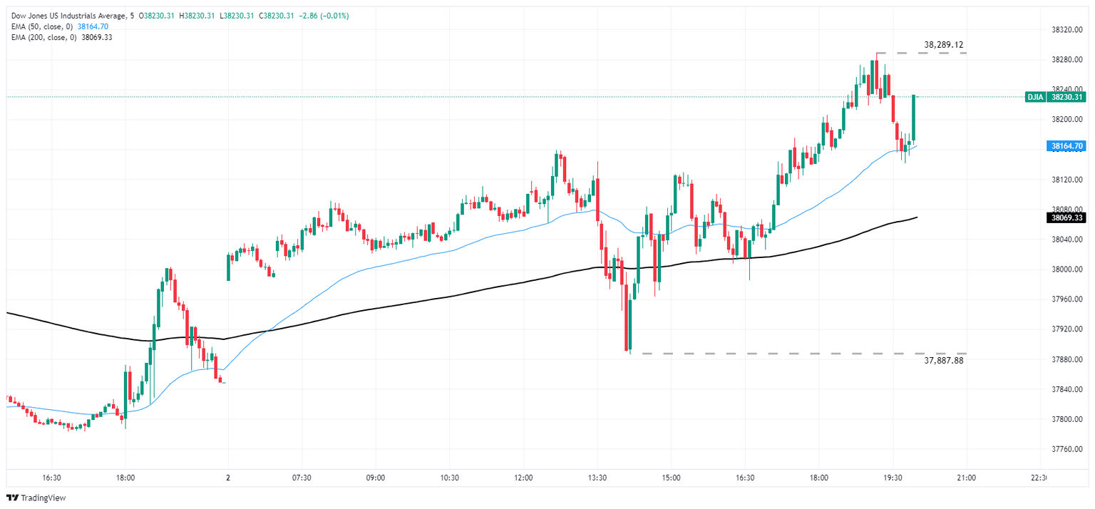 The DJIA found a high of 38,289.12 late in the Thursday American market session, with a quick tumble to 37,887.88 as investor risk appetite keeps one foot out of the door. Equities have recovered into the high end, but topside momentum remains thin as the Dow Jones churns in familiar territory close to the 38,000.00 handle.