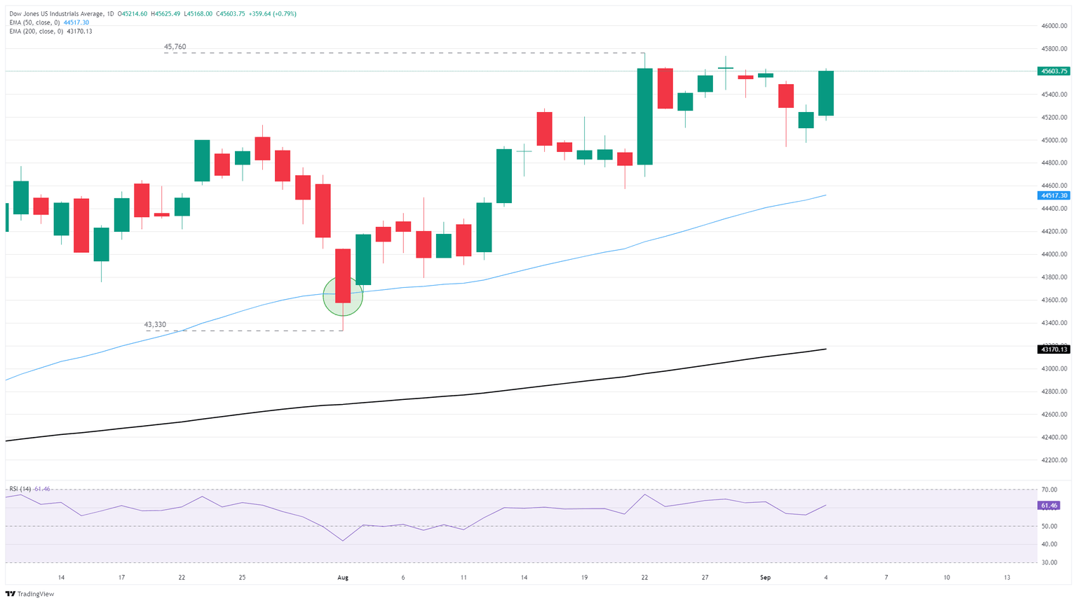 The Dow Jones still remains in the red for the week, but only slightly, within touch range of the week’s opening bids and trailing just behind the 45,600 level. The major index is poised for a fresh break toward new record highs above 45,760, but only if US Nonfarm Payrolls (NFP) data plays bullish ball on Friday.