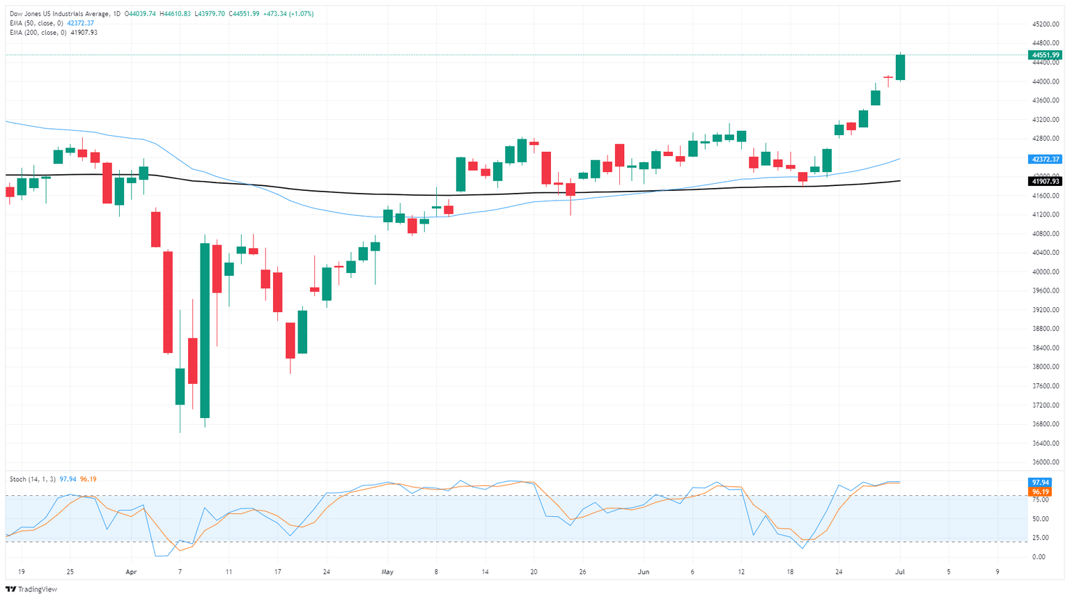 The Dow Jones surged around a full percent on Tuesday, climbing above 44,500 for the first time in several months. The major equity index is now on pace to take a fresh run at all-time highs north of 45,000, but bidders will have to contend with overbought conditions and a possible relief pullback first. Technical oscillators are pinned deep in overbought territory, and intraday bids have reached their highest differential from the 50-day Exponential Moving Average (EMA) since late 2024, with the medium-term moving average rising into 42,380.