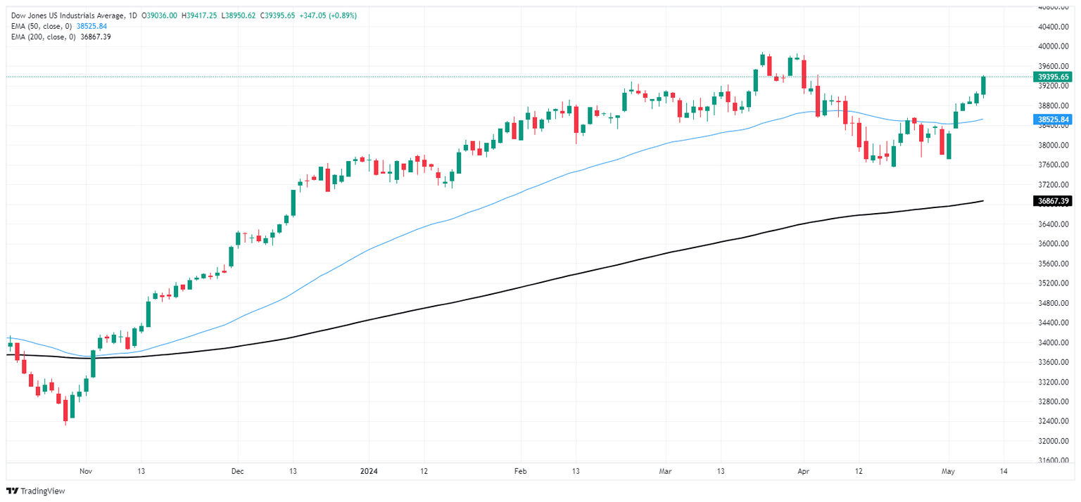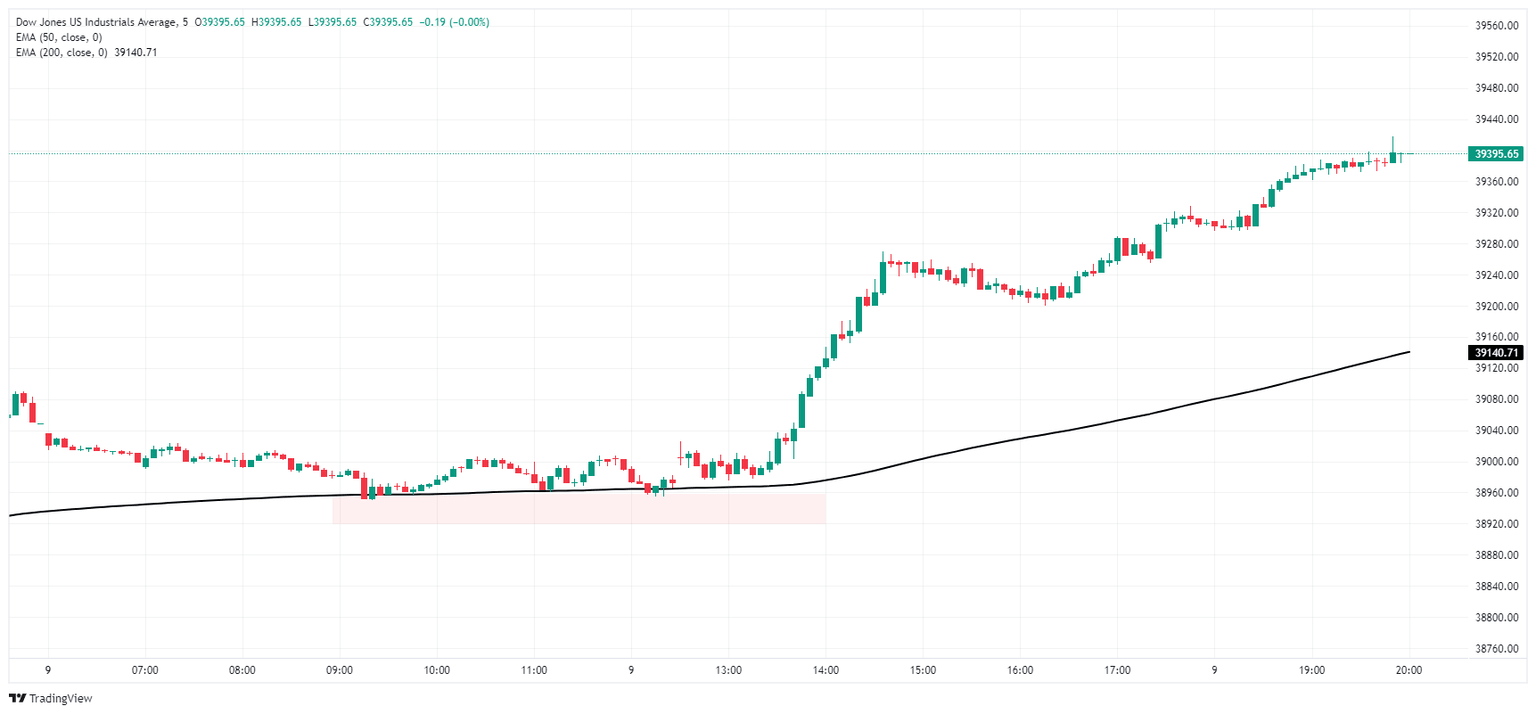 The Dow Jones is up over 330 points on Thursday, climbing 0.85% as the major equity index grinds its way back to record highs approaching 40,000.00. The index found an early price floor near 38,950.00, and the DJIA hit the closing bell trading at 39,387.76.