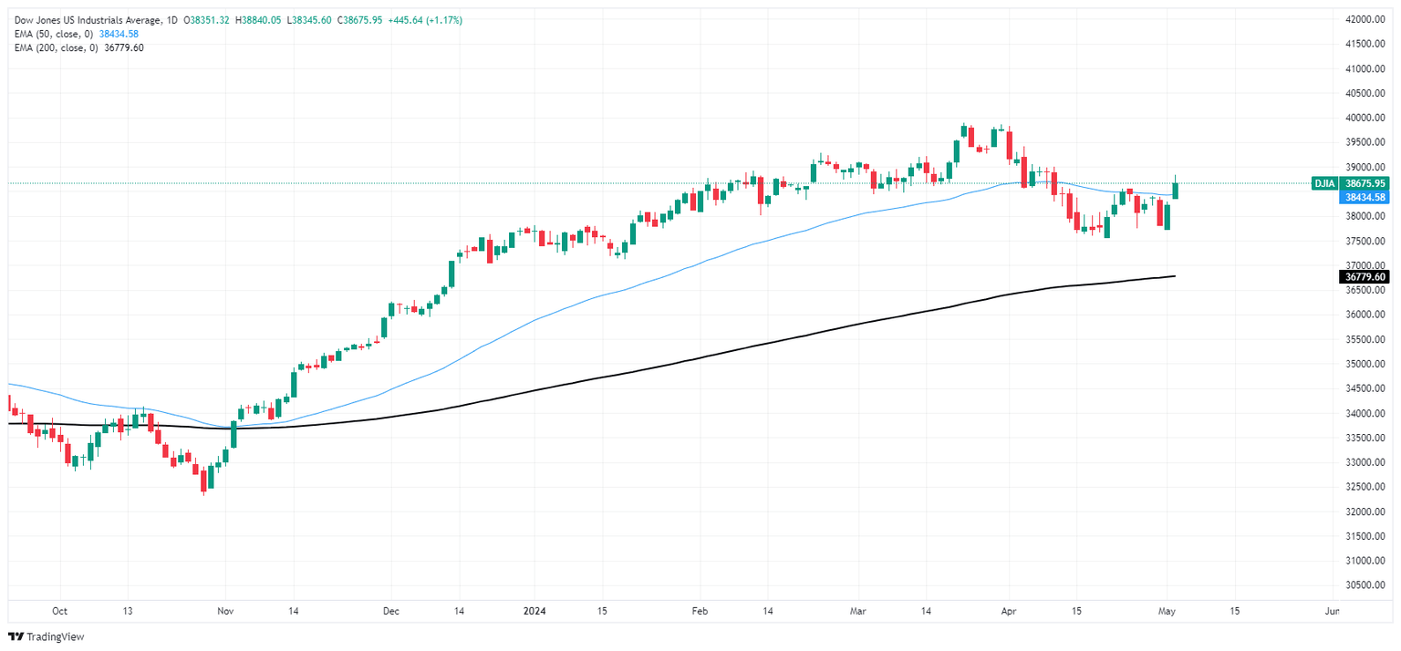 The Dow Jones Industrial Average (DJIA) gained nearly 1.2% on Friday after a broad miss from US Nonfarm Payrolls (NFP) and other key labor data revealed a steep weakening in the US domestic economy, sparking increased bets of rate cuts from the Federal Reserve. The US added fewer jobs than expected in April, and the Unemployment Rate ticked higher. The ISM Services Purchasing Managers Index (PMI) also fell to a 16-month low as economic activity confirms a steepening economic slowdown.